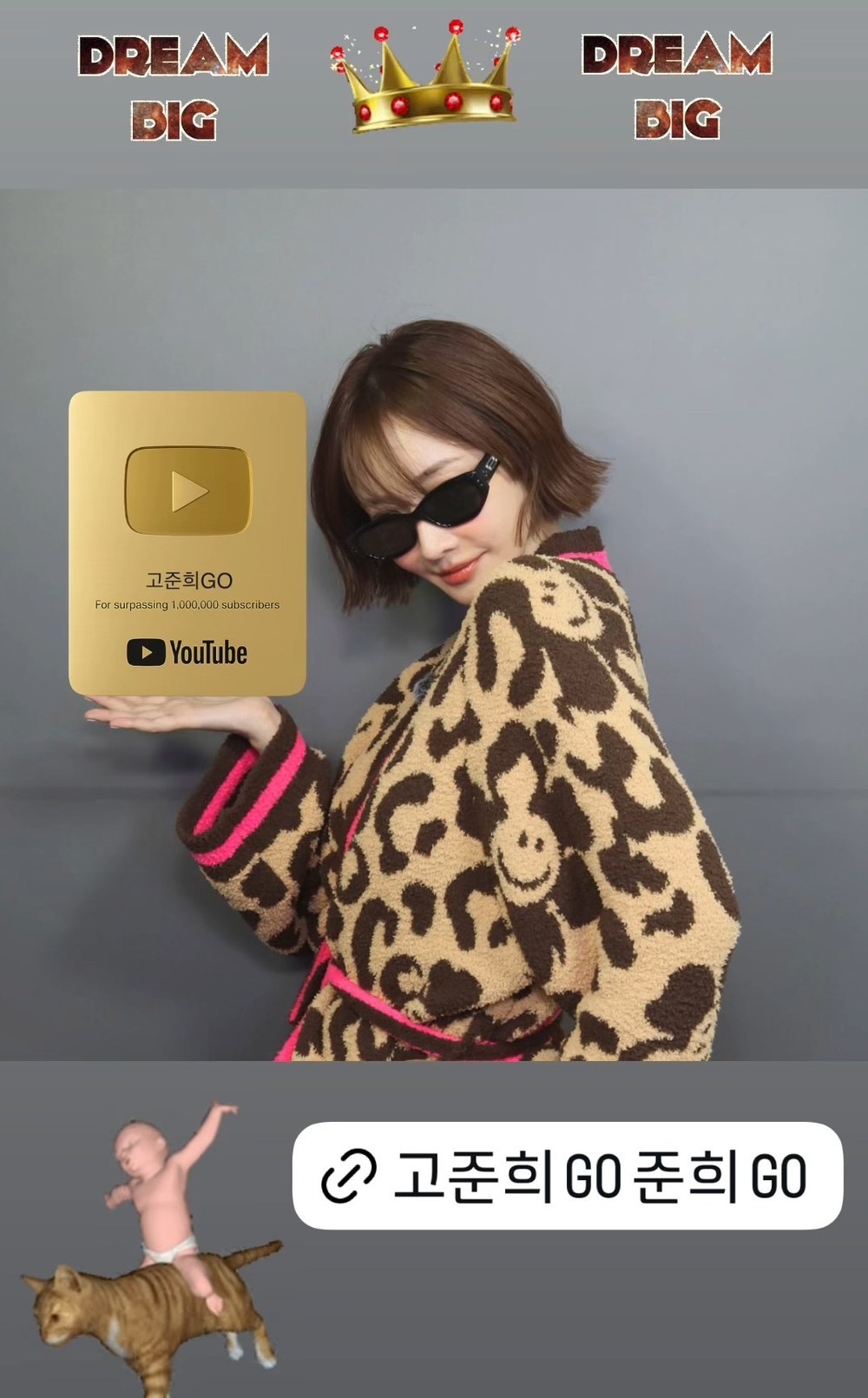 사진=고준희소셜미디어[뉴스엔이하나기자]배우고준희가골드버튼을향한열망을드러냈다.고준희는지난10월7일자신의소셜미디어에“고준희GO준희GO”라는글에자신의유튜브채널링크를태그했다.함께공개된사진에서고준희는합성으로손바닥에‘고준희GO’채널이적힌골드버튼을올린채당당한포즈를취하고있다.단발병을부르는헤어스타일에선글라스가시크한분위기를더한다.고준희는‘DREAMBIG’이라는스티커로골드버튼을향한바람을드러냈다.지난2월개설된고준희의‘고준희GO’채널은현재구독자5만4천명이다.앞서고준희는자신의채널게시판에“안녕하세요,여러분.대문사진영상은잘보셨나요?준비된3가지후보중마음에드는사진에투표해주세요.가장많은투표를받은사진으로대문을변경할예정이니꼭참여부탁드립니다”라는글과함께7일소셜미디어에게재되노사진을포함한3장의사진을게재했다.한편고준희는최근한뷰티브랜드모델로발탁됐으며,중국,일본등글로벌시장에서도러브콜을잇달아받고있는것으로전해졌다.뉴스엔이하나bliss21@기사제보및보도자료[email protected]ⓒ뉴스엔.무단전재&재배포금지Copyright©뉴스엔.무단전재및재배포금지.