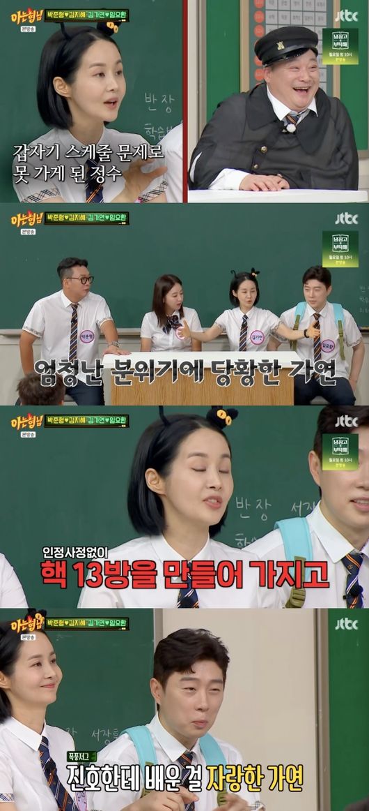 <방송시청후작성된리뷰기사입니다.>[OSEN=임혜영기자]김가연이임요환에게반했던순간을떠올렸다.4일방송된JTBC‘아는형님’에는김가연-임요환,박준형-김지혜가출연했다.박준형,김가연은연예인게임단으로만났다고밝혔다.박준형은“이커플이만나게된계기가게임단에서출발한다”라고말했고,김가연은“e스포츠가유명해지니까한국대표플레이어로초청이됐다.연예인게임단에서윤정수가가기로했다.윤정수가스케줄때문에못가서급히섭외된게나였다.홍진호를붙여줬다”라고설명했다.김가연은“갔는데임요환과게임을하게됐다.대형스크린까지있어서긴장했다.우리남편이인정사정없이핵13방을하더라”라고말했다.임요환은“그렇게까지할생각은없었는데진호한테배웠다고하더라.내가할수있는최대한의퍼포먼스로한번에쓸었다”라고설명했다.김가연은“내가승부욕이강한사람이다.‘나한테패대기친남자는네가처음이야’여기서호감이간것이다.사랑의감정이튼게아니다.(사랑은)총쏘면서(시작됐다).1인칭으로게임을많이한다.내가지나가면헤드샷만날린다.관심으로느껴진것이다”라고말했다.김가연은“항상괴롭히다가내가당하니까묘한감정이있더라.어느날같은팀이되었다.내가죽을위기에이남자가뛰어오더라.거기서사랑의감정을느꼈다”라고고백했다./[email protected][사진]JTBC‘아는형님’Copyright©OSEN.무단전재및재배포금지.