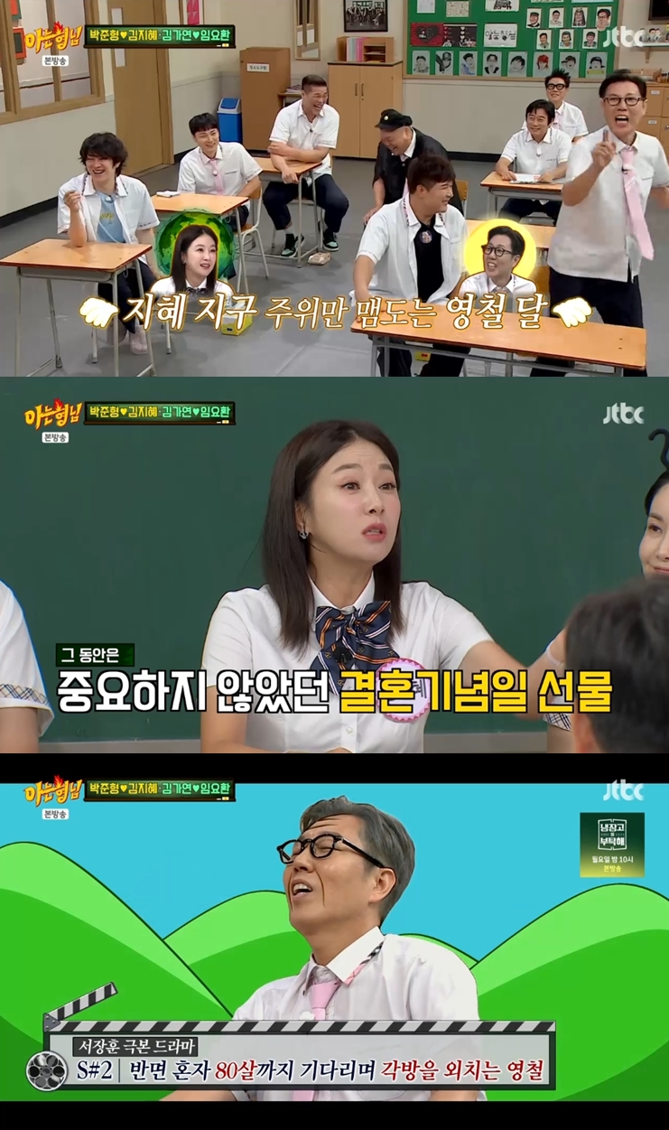 ▲출처|JTBC'아는형님'캡처[스포티비뉴스최신애기자]김영철이김지혜를기다리고있다는주장이나왔다.4일방송된JTBC'아는형님'에는박준형-김지혜,김가연-임요환부부가출연했다.이날박준형은과거자신의아내인김지혜의은근한'썸남'이었다는김영철에게"넌근데결혼안해?계속우리쪽만바라보고있는것같아서"라고콕집어웃음을자아냈다.그러자김지혜는"솔직히(개그맨이혼커플)1호가언제될지모르니까기념일을안챙겼다"고말했고,서장훈은"절대안될일이지만'이혼숙려캠프'먼저와주라"고당부해웃음을더했다.이같은대화중,이수근은"그럼(김)영철이한테기회가없는건아니잖아"라고거들었고,박준형역시"나한테김영철이'각방안써?'라고물어보더라"고비화를전했다.그러자서장훈은김영철을향해"(대체김지혜를)언제까지기다리는거야"라고몰아가현장을초토화시켰다.<저작권자ⓒSPOTVNEWS.무단전재및재배포금지>Copyright©스포티비뉴스.무단전재및재배포금지.