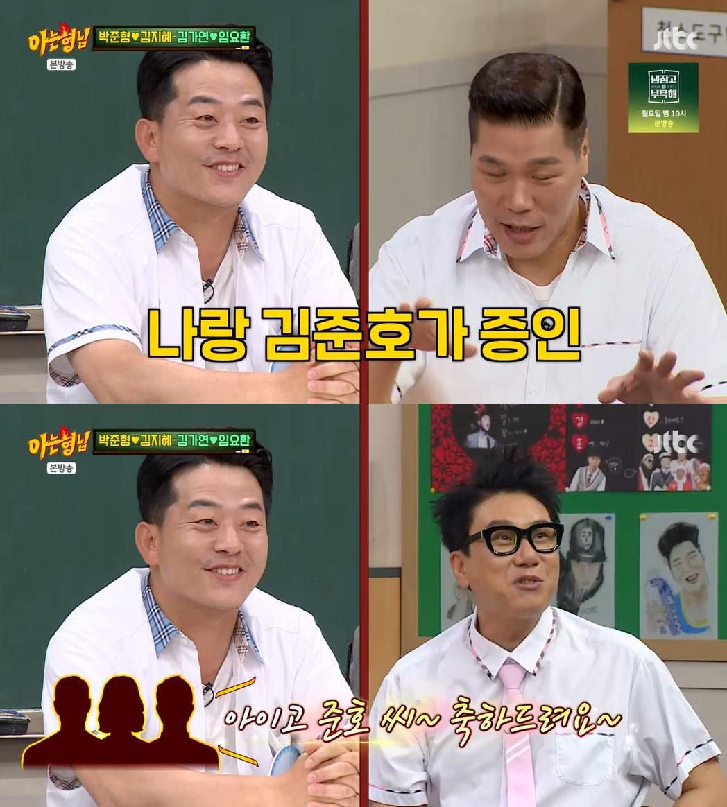 [스타뉴스|안윤지기자]/사진=JTBC예능프로그램'아는형님'방송캡처'아는형님'방송인이상민의혼인신고증인의정체는서장훈과김준호였다.4일방송된JTBC예능프로그램'아는형님'에서는김가연,임요환부부와박준형,김지혜부부가출연했다.이날김가연은"혼인신고를몰래하고싶었다.이런얘기를아무도할수없지않나.그땐검색이쉽지도않았다.혼인신고증인을남편은지인이,난준형이가사인해줬다"라고설명했다.서장훈은이상민의혼인신고에대해"나랑김준호가해줬다"라고했다.이상민은"내가혼인신고를하면갔는데김준호가혼인신고를한줄알고'축하드려요'했다.장훈이가보호한다는신념하에'사진X,극비상황이다'라고했다"라고털어놨다.그러자서장훈은"기사가나오기전인데멀리서찍으시면어쩔수없는데너무가까이서찍으니까"라며훈훈한분위기를만들었다.한편'아는형님'은매주토요일오후9시에방송된다.안윤지기자[email protected]©스타뉴스&starnewskorea.com,무단전재및재배포금지