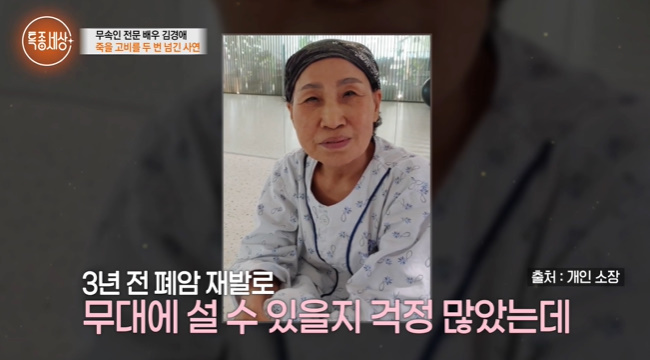 사진=MBN‘특종세상’캡처사진=MBN‘특종세상’캡처사진=MBN‘특종세상’캡처[뉴스엔이하나기자]무속인전문배우김경애가두번의폐암수술을겪었던사연을공개했다.10월2일방송된MBN‘특종세상’에서는배우김경애의근황이공개됐다.데뷔59년차무속인전문배우김경애는이런새벽미숫가루로아침을간단히해결한뒤1박짐을챙겨오랫동안다닌옆동네미용실에서단장했다.메이크업후용산역에도착한김경애는KTX를타고전주에서열린환경보호를위한자원순환패션쇼행사장에도착했다.패션쇼참가자들로발디딜틈없는대기실에서의상을갈아입고화려한장신구로멋을낸김경애는“난화려한거좋아한다.빨주노초파남보.배우잖아.가수잖아.예뻐야되잖아”라고말했다.6년전앨범을내며트로트가수로데뷔한김경애는이날초대가수로무대에섰다.무대에설수있는것만으로도감사하다는김경애는“제가사경을헤맨적이있다.건강검진하러갔는데X-ray사진에뭐조그만게있다더라.폐암1기가나온거다.놀라서난리가났다.1기니까조그만거제거하고5년뒤면다낫는다고했는데4년7개월만에또나타난거다.기절초풍했다.또수술했다.두번수술하고이렇게살아있다”라며7년전73세에폐암1기수술,3년전폐암재발로총두번의수술을받았다고밝혔다.뉴스엔이하나bliss21@기사제보및보도자료[email protected]ⓒ뉴스엔.무단전재&재배포금지Copyright©뉴스엔.무단전재및재배포금지.