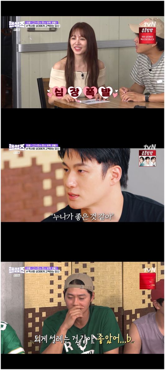 <리뷰:방송시청후작성된리뷰기사입니다.>[OSEN=오세진기자]‘핸썸가이즈’윤은혜가저녁게임게스트로등장해설레는고백을듣다가설렘을감추지못했다.2일방영한tvN예능‘핸썸가이즈’에서는저녁게임게스트로윤은혜가등장했다.다양한종류의고기가게임실패때마다빠지는룰을들은윤은혜는"저밥안먹고왔다"라고말해멤버들의의지를불태우게했다.2라운드게임은설레는고백을하는게임이었다.윤은혜는그고백순서를맞혀야했다.차태현은김은숙작가의‘파리의연인’속박신양의명대사“애기야,가자”를그대로말하며윤은혜의손목을잡았다.윤은혜는“미치겠네.대체몇이야”라며깔깔웃었다.이어김동현은“사실콘서트티켓을샀다.노래를들으려고샀다”라며진짜팬인듯부끄러워했다.김동현은“오늘등장하실때빛이났다.그래서저는거절당한건가요?”라며마저고백을이었고모두가의아해했다.한편윤은혜보다11살어린신승호는“누나,나는누나가좋아하는거같아.계속생각나고,네가좋아하는거같아”라며본격적인연기톤을잡고윤은혜를직시했다.이에윤은혜는“되게설렌다”라며웃었고,모두가"이거게임이야"라며윤은혜를말렸다./[email protected][사진출처]tvN예능‘핸썸가이즈’Copyright©OSEN.무단전재및재배포금지.