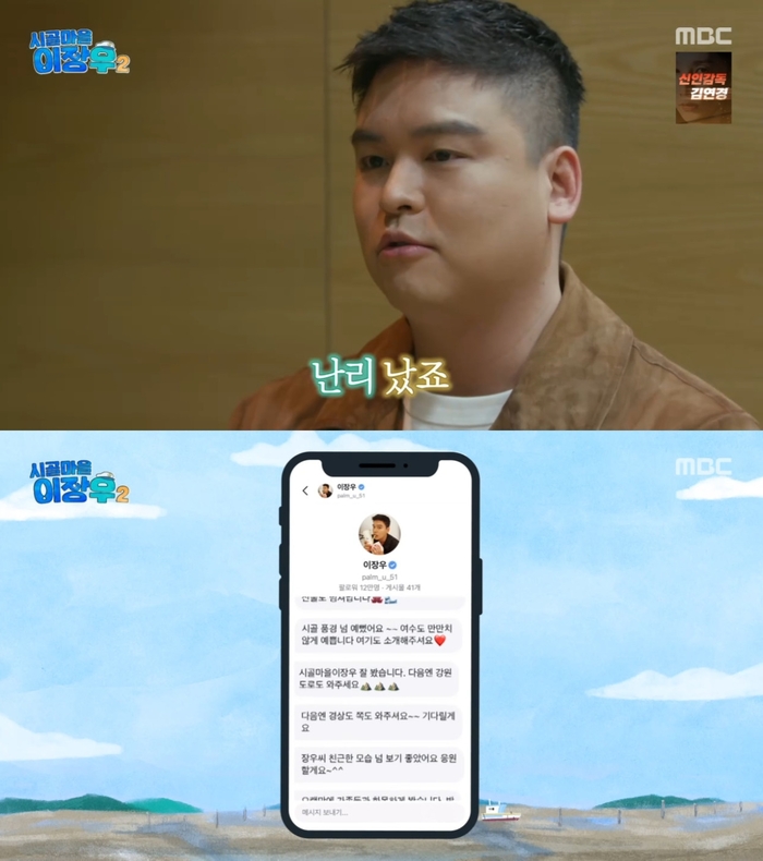 ‘시골마을이장우2’.사진IMBC‘시골마을이장우2’방송캡처배우이장우가‘시골마을이장우’시즌1비하인드를전했다.30일방송된MBC‘시골마을이장우2’에서는제작진과만난이장우의모습이그려졌다.이날이장우는오랜만에제작진과만났다.제작진이“요즘어떻게지냈냐”고묻자이장우는“작년보다요리관련된실력이더늘었다.수준이좀올라갔다”고웃었다.이장우는‘시골마을이장우’시즌1당시전라북도김제에서쌀농사를지어막걸리를출시한바있다.제작진이“시즌1나가고주변반응이어땠냐”고묻자이장우는“난리났다.너무잘돼서DM도몇백개받았다”고해눈길을끌었다.한편‘시골마을이장우2’는매주화요일오후9시방송된다.[이세빈스타투데이객원기자]Copyright©스타투데이.무단전재,재배포및AI학습이용금지