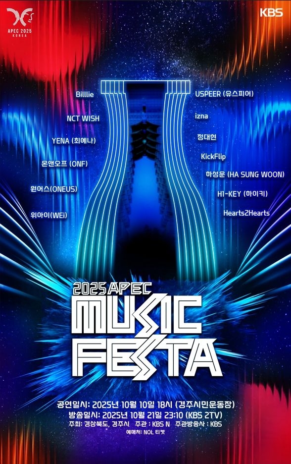 KBS제공2025년APEC정상회의를기념하는대규모K-POP콘서트,‘2025APECMUSICFESTA’가오는10월10일금요일경주시민운동장에서개최된다.대한민국이APEC의장국으로서세계각국정상들과외신관계자들을맞이하는자리에서,한국대중문화를함께소개하는공식문화행사로서의미를갖는다.아울러국제회의와문화교류가조화를이루는특별한무대가될전망이다.‘2025APECMUSICFESTA’는경상북도와경주시가공동주최하며,APEC정상회의준비위원회와협력해운영된다.주관방송사인KBSN은지역사회와지방정부가함께힘을모아안전하고수준높은공연을준비하고있다.무대에는Billlie(빌리),NCTWISH(엔시티위시),YENA(최예나),ONF(온앤오프),ONEUS(원어스),WEi(위아이)를비롯해USPEER(유스피어),izna(이즈나),JUNGDAEHYUN(정대현),KickFlip(킥플립),HASUNGWOON(하성운),H1-KEY(하이키),Hearts2Hearts(하츠투하츠)등다채로운아티스트들이출연한다.세대와스타일을아우르는라인업은K-POP의폭넓은세계를선보이는핵심무대가될것이다.현장뜨거운열기는991만명의구독자를보유한KBSKpop유튜브를통해실시간으로느낄수있을뿐아니라,시차를두고방송을통해서도만날수있다.오는10월21일밤11시10분KBS2를시작으로,KBSN,KBSWorld채널을통해서‘APECMUSICFESTA’가전세계에방영된다.특히KBSWorld유튜브채널은2030만명의구독자를보유하고있어,현장에함께하지못하는국내외시청자들은다양한방법을통해글로벌축제의감동을공유할수있을전망이다.또이번APEC뮤직페스타의특별프로그램으로‘WomanOnMusic(WOM)’이10월24일금요일오후5시보문호수수상무대에서개최된다.약90분간진행되는이무대에는한국·중국·일본·러시아·베트남등5개국의대표여성아티스트들이출연하여미래세대를위한희망의메시지를전달하여APEC정상회의기간중국제적인문화교류의상징적인무대가될것으로기대된다.행사관계자는“2025APEC뮤직페스타는단순한콘서트를넘어,한국의문화적저력을전세계에보여주는장이될것”이라며“APEC정상회의의핵심키워드인‘연결,혁신,번영’을문화의언어로풀어내는무대로만들기위해중앙정부,지자체,민간이긴밀히협력하고있다”고말했다.‘2025APECMUSICFESTA’의세부프로그램,관람안내,교통및안전대책등은향후공식채널을통해순차적으로공개될예정이다.현장공연입장권은30일오후5시부터NOL인터파크를통해접속한신청자들에게무료로배포된다.경주에서는같은날인10월10일부터12일까지신라문화제가열린다.경주의전통과역사를현대적으로재해석해선보이는대표적인문화축제로,월정교를배경으로펼치는전통·현대공연,거리예술,실크로드페스타등다채로운프로그램이이어질예정이다.이번신라문화제와APEC뮤직페스타가함께열리면서,경주는역사와대중문화가공존하는특별한축제의장이될전망이다.공연과축제가동시에펼쳐지는경주는정상회의참가국대표단은물론일반시민과전세계관광객들에게개방되며,이를통해한국의역동적인대중문화와경주의풍부한역사·관광자원을함께알리고지역경제에도활력을불어넣을것으로기대된다.손봉석기자[email protected]©스포츠경향.무단전재및재배포금지.