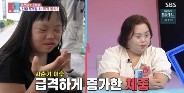 [서울=뉴시스]동상이몽.(사진=SBSTV캡처)[email protected]*재판매및DB금지[서울=뉴시스]이재훈기자=다운증후군작가정은혜가악플때문에다이어트를시작했다.29일방송된SBSTV가족예능물'동상이몽2-너는내운명'에는정은혜,조영남부부가식단관리를하는모습이그려졌다.조영남은이날방송에서정은혜를위해건강식을차렸다.이들부부는하루한끼를건강식으로먹는생활을한달동안유지하고있다.해당장면을VCR로지켜보던정은혜모친은"은혜학창시절부터고민인게살이다.사춘기이후급격하게쪘다.대사가잘안돼문제가생기는것같다"고안타까워했다.다운증후군증상인낮은기초대사량이체중증가원인으로추정된다.정은혜어머니는"인터넷댓글에서살로계속공격을당하고있다"라며분노했다.정은혜는이전보다살이확실히빠진모습이었다.MC김구라는"진짜몰라봤다"라며놀랐다.정은혜는tvN'우리들의블루스'(2022)에서'이영옥'(한지민)쌍둥이언니'이영희'를연기해주목받았다.남자친구이던조영남과지난5월결혼했다.☞공감언론뉴시스[email protected]©뉴시스.무단전재및재배포금지.