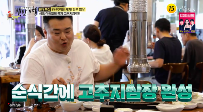 방송시청후작성된리뷰기사입니다.[OSEN=박하영기자]‘식객허영만의백반기행’셰프이원일이고추지쌈장레시피를공개해눈길을끌었다.28일방송된TV조선‘식객허영만의백반기행’(이하‘백반기행’)에서는셰프이원일이게스트로출연해자신만의양념장레시피를공개했다.이날이원일은허영만과함께안심과새우살을먹던중“혹시고추장아찌같은거있으면제가여기다가고추지쌈장만들겠다.(같이)먹으면더맛있을거같은데만들어볼까요?”라고해궁금증을모았다.이어“요즘보면고추장아찌가가지고있는산미가좋다.그래서저는쌈장,다진마늘,고추장아찌,통깨를넣는다”라며초간단레시피를공개하며순식간에고추지쌈장을완성했다.허영만은“사장님여기와서이것좀잡숴보세요”라고했고,사장님은이원일표고추지쌈장에감탄했다.허영만역시고기풍미를극대화하는맛에만족감을드러냈다.셰프답게이원일은주변손님들에게직접만든고추지쌈장을나눠주기도했고,이에질세라허영만은“이맛있는걸우리만먹을수없다”라며제진까지챙겨훈훈함을자아냈다./mint1023/@osen.co.kr[사진]‘식객허영만의백반기행’방송화면캡처Copyright©OSEN.무단전재및재배포금지.
