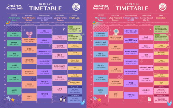 ‘그랜드민트페스티벌2025’최종타임테이블(제공:민트페이퍼)매년음악팬들의큰사랑을받아온가을대표음악축제‘그랜드민트페스티벌2025’(GrandMintFestival2025,이하GMF)가최종타임테이블과각일자별,스테이지별헤드라이너를공개했다.이번GMF는‘AKMU(악뮤)’,‘LUCY(루시)’,‘10CM(십센치)’,‘터치드’,‘실리카겔’,‘홍이삭’,‘윤하’,‘쏜애플’,‘N.Flying(엔플라잉)’,‘소란’등전통페스티벌강자들과‘PAMUNGKAS(파뭉카스)’,‘TELEVISIONOFF(텔레비전오프)’,‘MichealKaneko(마이클가네코)’,‘WendyWander(웬디완더)’등국내에서보기힘든해외아티스트들이합류하며‘역시가을엔GMF’라는호평을받고있다.‘그랜드민트페스티벌2025’10월18일악뮤,루시,실리카겔아티스트포스터(제공:민트페이퍼)10월18일‘MintBreezeStage(민트브리즈스테이지)’에는단독콘서트‘악동들’을성공적으로마치고돌아온믿고듣는아티스트‘AKMU(악뮤)’를필두로‘적재’,‘정승환’,‘폴킴’,‘george(죠지)’,‘까치산’이함께한다.헤드라이너로등장하는‘AKMU(악뮤)’는다채로운음악과신선한무대구성으로첫GMF무대를장식할예정이다.또한청량하면서도파워풀한사운드로각종페스티벌무대를섭렵한‘LUCY(루시)’가‘ClubMidnightSunset(클럽미드나잇선셋)’의마지막을책임지며‘터치드’,‘Daybreak(데이브레이크)’,‘유다빈밴드’,‘김뜻돌’,‘can’tbeblue(캔트비블루)’가출연한다.이날‘STATIONSTARDUSTbyCDF(스테이션스타더스트by카다판)’의마지막은평단과리스너들을사로잡은대체불가밴드‘실리카겔’이무대에오르며‘페퍼톤스’,‘오월오일’,‘지소쿠리클럽’,‘TELEVISIONOFF(텔레비전오프)’,‘리도어’,‘KIK(킥)’이밴드사운드가득한무대를선보인다.한편‘LovingForestGarden(러빙포레스트가든)’에서는8개월만에싱글로돌아온싱어송라이터‘소수빈’과함께‘정세운’,‘PAMUNGKAS(파뭉카스)’,‘김수영’,‘GEMINI(제미나이)’,‘우예린’이따뜻하고감성적인분위기를더할예정이다.더불어‘RollingQuartz(롤링쿼츠)’,‘이준형’,‘민서’,‘컨파인드화이트’,‘evenif(이븐이프)’,‘키스누’가‘brightLab(브라이트랩)’에서팬들과의만남을준비중이다.‘그랜드민트페스티벌2025’10월19일홍이삭,윤하,엔플라잉아티스트포스터(제공:민트페이퍼)10월19일‘MintBreezeStage(민트브리즈스테이지)’에서는첫페스티벌헤드라이너무대를선보이는‘홍이삭’이주목을끈다.다양한무대경험과꾸준한음악활동으로팬들의사랑을받아온‘홍이삭’은감미로운음색으로선선한가을밤을수놓을예정이다.이어‘10CM(십센치)’,‘멜로망스’,‘하동균’,‘데이먼스이어’,‘GOGOHAWK(고고학)’이함께해GMF두번째날의열기를이어간다.또한독보적인보컬리스트‘윤하’의헤드라이너무대가펼쳐지는‘ClubMidnightSunset(클럽미드나잇선셋)’에서는‘CNBLUE(씨엔블루)’,‘소란’,‘카더가든’,‘원위’,‘Hi-FiUn!corn(하이파이유니콘)’이각자의매력을선보인다.같은날‘STATIONSTARDUSTbyCDF(스테이션스타더스트by카다판)’의마지막은역대급무대를갱신하며커리어하이를이어가고있는‘N.Flying(엔플라잉)’이장식한다.이와함께‘쏜애플’,‘DragonPony(드래곤포니)’,‘THESOLUTIONS(솔루션스)’,‘WendyWander(웬디완더)’,‘SNAKECHICKENSOUP(스네이크치킨수프)’,‘LOWHIGHLOW(로우하이로우)’가폭발적인퍼포먼스로열기를고조시킨다.더불어OST음원강자‘너드커넥션’의헤드라이너무대와함께‘스텔라장’,‘MichealKaneko(마이클가네코)’,‘범진’,‘KEN(켄)’,‘OurR(아월)’이‘LovingForestGarden(러빙포레스트가든)’을채우며‘박소은’,‘연정’,‘공원’,‘blah(블라)’,‘베리코이버니’,‘삼월생’이‘brightLab(브라이트랩)’무대에올라관객들에게잊지못할순간을선사한다.올해GMF는5개의멀티스테이지에서펼쳐지는62팀의공연과함께아티스트와팬이직접만나는‘FanMeetup’,‘GMF2025Awards’,‘민트우체국’,‘민트샵’등다채로운현장콘텐츠를선보인다.또한‘COUNTDOWNFANTASY’의열기를그대로옮겨온‘STATIONSTARDUSTbyCDF’는격정적인밴드사운드와슬램존을통해페스티벌의에너지를극대화할것을예고했다.현장에는에어바운스,트램펄린등다양한어트랙션이마련되며10년만에돌아온‘페스티벌보이’주우재가전야제‘그대,모든짐을내게inGMF’로페스티벌의시작을알린다.아울러‘ROUND(라운드)’와‘서울뮤직포럼’과의협업으로아티스트와업계관계자가교류할수있는음악포럼도진행된다.GMF는이처럼다채로운프로그램으로가을대표음악축제로서의면모를다시금증명하고,코로나이전의진정한페스티벌본질을담아찾아온다.10월18~19일양일간송파구올림픽공원에서진행되는‘그랜드민트페스티벌2025’의공식티켓은NOL티켓,YES24,NAVER예약을통해예매할수있다.주요일정을비롯한다양한정보는주최사인민트페이퍼홈페이지와그랜드민트페스티벌공식SNS를통해확인이가능하다.한효주기자bnt뉴스연예팀기사제보[email protected]©bnt뉴스.무단전재,재배포및AI데이터활용금지