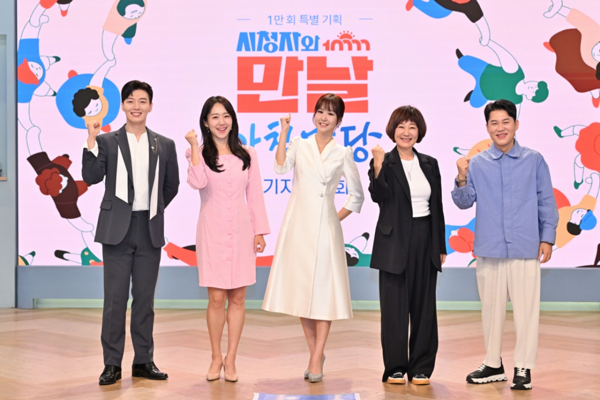 왼쪽부터엄지인,박철규엄지인박철규김혜영남상일윤수현왼쪽부터김대현PD,박철규엄지인,김혜영,윤수현,남상일[뉴스엔장예솔기자]34년간시청자들에게기쁨과위로를건넨'아침마당'이역사적인1만회를맞았다.9월24일오전서울영등포구여의도KBS본관에서KBS1TV'아침마당'1만회기념기자간담회가진행됐다.이자리에는김대현PD,엄지인,박철규,윤수현,김혜영,남상일이참석했다.'아침마당'은일상에서만나는선한이웃들의다양한이야기들을요일별로특화해감동과재미,가치와의미를느끼게하는프로그램.지난1991년5월20일'이계진의아침마당'이라는타이틀로시작된'아침마당'은34년간시청자들의매일아침을책임졌다.이날김대현PD는'아침마당'이가진의미에대해"프로그램을맡은지얼마안됐지만가장크게느낀건'시청자분들께위로를주고있구나'라고생각한다.수만가지이야기를나누며시청자와함께만나고,그이야기를통해위로를건네주는프로그램"이라고정의했다."그런부분이올드하다고느낄수있다"고덧붙인김대현PD는"'아침마당'이조금씩변화하고있다.특히이번에윤수현씨도새로운MC로모셨고,또다른변화도진행중이다.그러면서젊고일반적으로생각하는타겟층을조금씩늘리기위해노력하고있다"며"너무자극적이거나달콤하지않은,늘옆에있는'밥'같은존재라서장수하고있는것같다"고털어놨다.엄지인은"제가이금희아나운서후임이라엄청난파장을불러일으켰다.'아침마당'이많은사랑을받고,시청층을더확대하면서젊어졌다는이야기와함께1만회까지이어졌다.'그이유가뭘까','진행자가바뀌면위기아닌가'생각했는데진행자가바뀌어도이때까지올수있었던건'아침마당'정신그리고시청자들이그답인것같다.매일하는생방송이라피드백이확실하다.'이게좋았다','저게나빴다'등반응을보내주면서시청자들과함께만들어가는방송이다.라디오를오래하면청취자와가족같다고하는데TV에서는'아침마당'이유일한것같다.그렇기때문에생방송이힘들어도뚜벅뚜벅이어가고있다.시청자들에대한보답"이라고전했다.지난7월KBS명예퇴직과함께'아침마당'을떠난김재원아나운서의후임으로최연소MC가된박철규는"엄지인아나운서옆에서열심히마당쇠역할을하고있다"고운을떼며"91년12월생인데제가태어나기전에'아침마당'이만들어졌다.같은해에태어났다고볼수있다.'아침마당'이어쩜이렇게오래힘을유지할수있는지새삼놀랐고,그만큼유지할수있었던건시청자들의응원과사랑덕분이라고생각한다.1만회를제가할수있다는것이감사하고,그만큼열심히준비하고있다"고소회를밝혔다.그간선배아나운서들과MC호흡을맞춘엄지인은처음으로후배를이끌게됐다.부담감이없는지묻자"그런질문을많이받았는데'왜박철규가MC가됐을까'그생각부터했다.그동안남자MC는이상벽,손범수,김재원,윤인구선배님등어마어마한MC들이지나갔다.'왜박철규가내짝꿍이됐을까'가장주안점을뒀는데급변하는방송환경속에서'아침마당'이새로운방향성에대한고민을했던것같다"고전했다.이어"'아침마당'이올드하다고말씀하시는분들도계신다.이제는젊은이미지와새로운방향성을보여줘야하기때문에박철규가MC가됐다고생각한다.그래서제가이끌어간다는생강을버리고있다.이미잘하고있는친구라MC가된것"이라며"철규는잘하니까제가믿고있다.나없이도이친구가잘놀수있도록제가이끈다는생각을최대한미루고있다"고후배를향한믿음을드러냈다.'아침마당'의대표코너인'도전꿈의무대'는임영웅,박서진,신성등한국트로트를대표하는스타들이거쳐갔다.오디션프로그램에서성공을거둔이후재출연한박서진,신성과달리임영웅은아직재출연소식이없다.이에김대현PD는"임영웅씨와계속연락하고소통도자주하는데너무바쁘더라.여러가지로바쁘시지만계속연락하고있다.언젠가는'아침마당'에서함께할그날이올거라고생각한다"고귀띔했다.'도전꿈의무대'패널로활약중인김혜영은"간절하고열심히하는분들이참여하는코너다.꿈꾸던무대에서서본인삶의이야기를나누고,노래를부름으로써'모든사람들이공감하느냐'에따라투표하고점수를받는코너"라고소개하며"임영웅씨도처음부터선택받은것이아니라무대8번을서서5승을했다.그래서기억에많이남는다"고털어놨다.남상일역시'아침마당'출연을통해달라진위상을자랑했다.그는"'아침마당'출연후출연료가달라졌다.출연전에는애매모호한순서에노래했는데지금은오프닝아니면클로징에서노래하고있다"며"'아침마당'은제성장과정을담고있다.어릴때'아침마당'을보면서소리를열심히해서부모님께효도해야겠다고다짐했다.또비혼주의라고했는데느닷없이'아침마당'을통해결혼을알렸고,득녀소식도알렸다.제게는가족이자인생의역사,일기장같은프로그램이다.제흔적을'아침마당'보면다알수있다"고애정을표했다.1만회특집에는프로그램역사인이계진,이금희,손범수역대MC들과강부자,남진,김성환,김연자,송가인,안성훈,박서진등그간'아침마당'을빛냈던스타들이총출동한다.1만회이후'아침마당'이어떻게변화할지도궁금한포인트.이에엄지인은"회사에부탁이있다.제작비를올려주시면더성대하게할수있으니사장님께부탁드린다"는유쾌한입담을선보였다.한편'아침마당'은매주월요