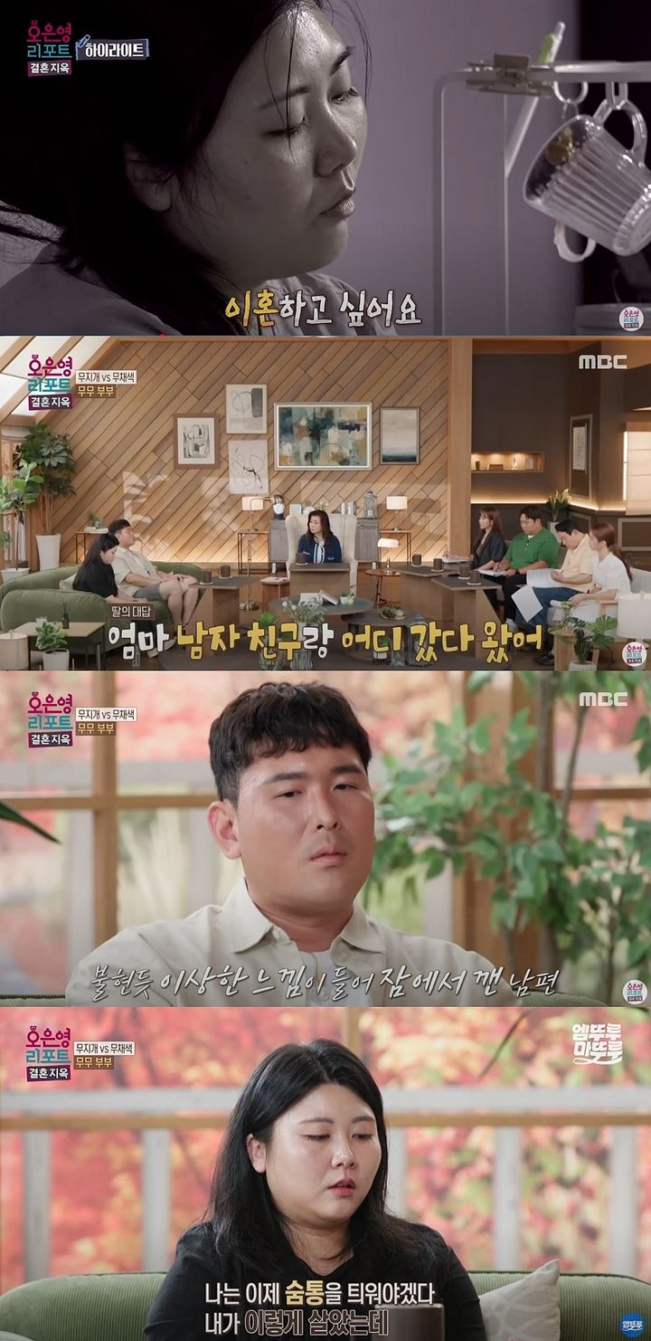 [서울=뉴시스]지난22일방송한MBCTV예능프로그램'오은영리포트결혼지옥'엔이른바'무무부부'가출연했다.(사진=MBC'오은영리포트결혼지옥'캡처)[email protected]*재판매및DB금지[서울=뉴시스]신지아인턴기자=남편이아내외도사실을딸에게들은충격적인일화를공개했다.지난22일방송한MBCTV예능프로그램'오은영리포트결혼지옥'엔이른바'무무부부'가출연했다.앞서부부는연애8개월만에결혼했다고했다.남편은"연애시절아내가가장큰휴식처같았다"고말했다.그러나현재아내는"이혼사유가너무많은데지금못하고있다"고했다.그가공개한영상에서남편은소리를지르고술을먹으면위협적으로행동했다.남편은"네가주말마다그XX만나러가지않았냐"고말했다.그는"이전에딸에게뭐했냐고물으니엄마남자친구와어디갔다고하더라"라고했다.남편은"어느날새벽에이상한느낌이들어서깨보니안방에서아내가외도상대랑전화를했다"며"사랑을나누는대화가오갔다"고말했다.아내는"이혼얘기를하고숨통을틔워야겠다생각하고(외도를저질렀다)"라고했다.그는"제딴에선남편을위해서거짓말하고내마음대로살겠다고했다"고말했다.☞공감언론뉴시스[email protected]©뉴시스.무단전재및재배포금지.
