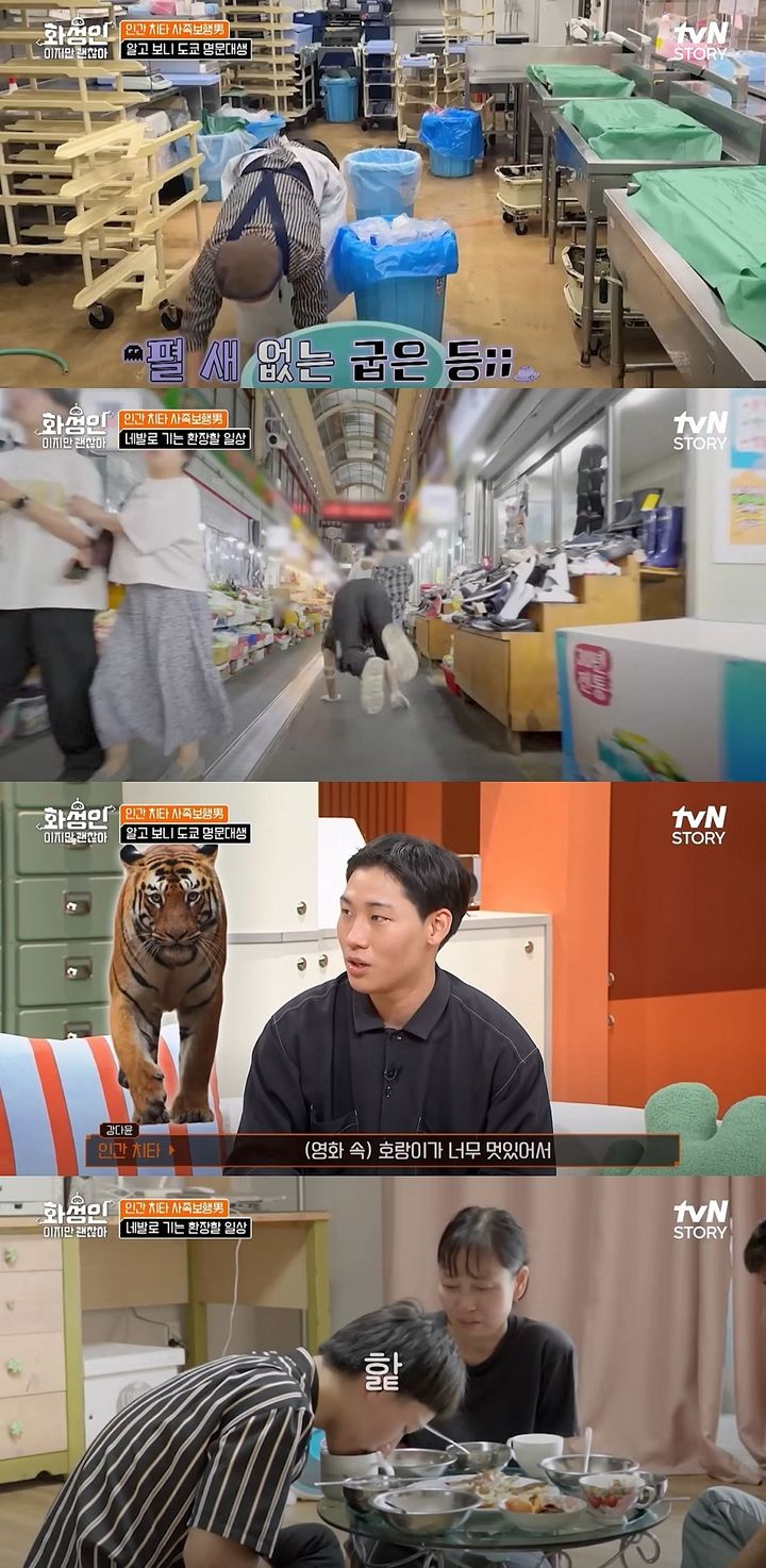 [서울=뉴시스]지난22일방송한tvN스토리예능프로그램'화성인이지만괜찮아'에선한남성이사족보행으로길을다니는모습을보여줬다.(사진=tvN스토리'화성인이지만괜찮아'캡처)[email protected]*재판매및DB금지[서울=뉴시스]신지아인턴기자=일본도쿄명문대생이8년넘게사족보행한이유를말했다.지난22일방송한tvN스토리예능프로그램'화성인이지만괜찮아'에선한남성이사족보행으로길을다니는모습을보여줬다.공개된영상에선그가손과발을이용해뛰어다녔다.남성은아르바이트를하면서도네발로다녔다.그는식사중에물을핥아먹었다.안정환이왜그렇게하냐고묻자남성은"전인간치타라그렇다"고답했다.남성은"초등학교6학년때영화'대호'를봤는데호랑이가너무멋있어서따라하고싶었다"고말했다.남성의아버지는"밥도혓바닥으로먹을때도있다"고했다.☞공감언론뉴시스[email protected]©뉴시스.무단전재및재배포금지.