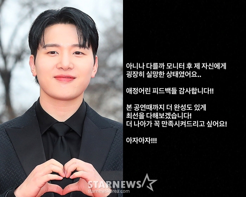 [스타뉴스|이승훈기자]/사진=스타뉴스,김민석SNS멜로망스멤버김민석이뮤지컬'데스노트'개막을앞두고자신의실력을객관적으로자평했다.김민석은22일개인SNS에"아니나다를까모니터후제자신에게굉장히실망한상태였어요.애정어린피드백들감사합니다"라고밝혔다.이어김민석은"본공연때까지더완성도있게최선을다해보겠습니다.더나아가꼭만족시켜드리고싶어요.아자아자!"라고당찬포부를전했다.앞서김민석은지난19일방송된KBS2TV'더시즌즈-10CM의쓰담쓰담'에출연해김성규와뮤지컬'데스노트'중'놈의마음속으로'라는넘버를불렀다.10월14일개막하는'데스노트'에서김민석은라이토역,김성규는엘(L)역으로무대에오른다.하지만해당넘버라이브이후일각에서는아쉽다는반응을내비쳤다.김민석의음색과'데스노트'의결이맞지않다는것.또한아직은다소어색한김민석의연기력도'데스노트'를이해하는데부족하다는평이주를이루고있다.김민석의캐스팅소식이처음으로전해진당시에도일부팬들은우려의목소리를낸바있다.김민석이속한멜로망스는지난4월여덟번째미니앨범'RomanceExpress'를발매했다.이승훈기자[email protected]©스타뉴스&starnewskorea.com,무단전재및재배포금지