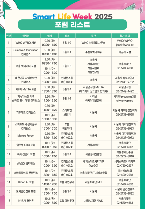 스마트라이프위크(SLW)2025포럼·컨퍼런스전체프로그램(개최일시순)서울시는오는9월30일부터10월2일까지사흘간강남구코엑스에서개최되는'스마트라이프위크(SLW)2025'기간동안,전세계도시리더와글로벌기업,학계와전문가가참여하는16개의국제포럼과컨퍼런스를연다고밝혔다.올해SLW2025는'사람을위한인공지능(AI),미래를여는스마트시티'를슬로건으로내걸고,공공정책과도시혁신,기술과산업트렌드,시민참여와교류까지아우르는다층적인의제를제시한다.서울시는올해16개포럼가운데서도특히메이어스포럼,서울빅데이터포럼,로봇전문가포럼,어반AI포럼,기후테크컨퍼런스등을핵심무대로꼽았다.올해메이어스포럼은'디지털격차해소를위한디지털포용과AI정책'을주제로열린다.특히기조연설자로나서는페트라플로리존느IBM퀀텀총괄임원은'양자중심슈퍼컴퓨팅'을주제로강연한다.양자컴퓨팅이기존슈퍼컴퓨터가풀수없던문제를해결해신약개발,금융리스크관리,교통물류최적화,기후변화대응등사회전반의혁신을이끌수있음을강조할예정이다.서울빅데이터포럼은'서울,데이터·AI와의동행으로미래를설계하다'슬로건아래AI와데이터가도시발전을견인하는방향을집중조망한다.기조연설은SAS인스티튜트디팍라마나단부사장이맡아“AI는더이상단순한도구가아니라도시전체를스스로최적화하는자율적두뇌가될것”이라며,교통·에너지·재난대응등도시기능전반에서의혁신가능성을제시한다.서울시와서울AI재단이공동주최하는어반AI포럼은'AI기반도시혁신과지속가능성'을주제로,글로벌도시문제해결을위한AI기술을공유하고세계최고연구진과의협력과교류를촉진하기위해마련됐다.기조연설은MIT센서블시티랩의카를로라티소장이맡는다.그는“AI와데이터는도시를이해하는새로운언어”라며,센서네트워크와AI분석이결합된혁신적도시운영모델을소개할예정이다.강옥현서울시디지털도시국장은“스마트라이프위크는세계도시들이모여정책과미래비전을공유하는정책플랫폼”이라며,“서울이글로벌담론을주도하며지속가능한스마트도시의미래를열어가겠다”고밝혔다.김명희기자[email protected]©전자신문.무단전재및재배포금지.