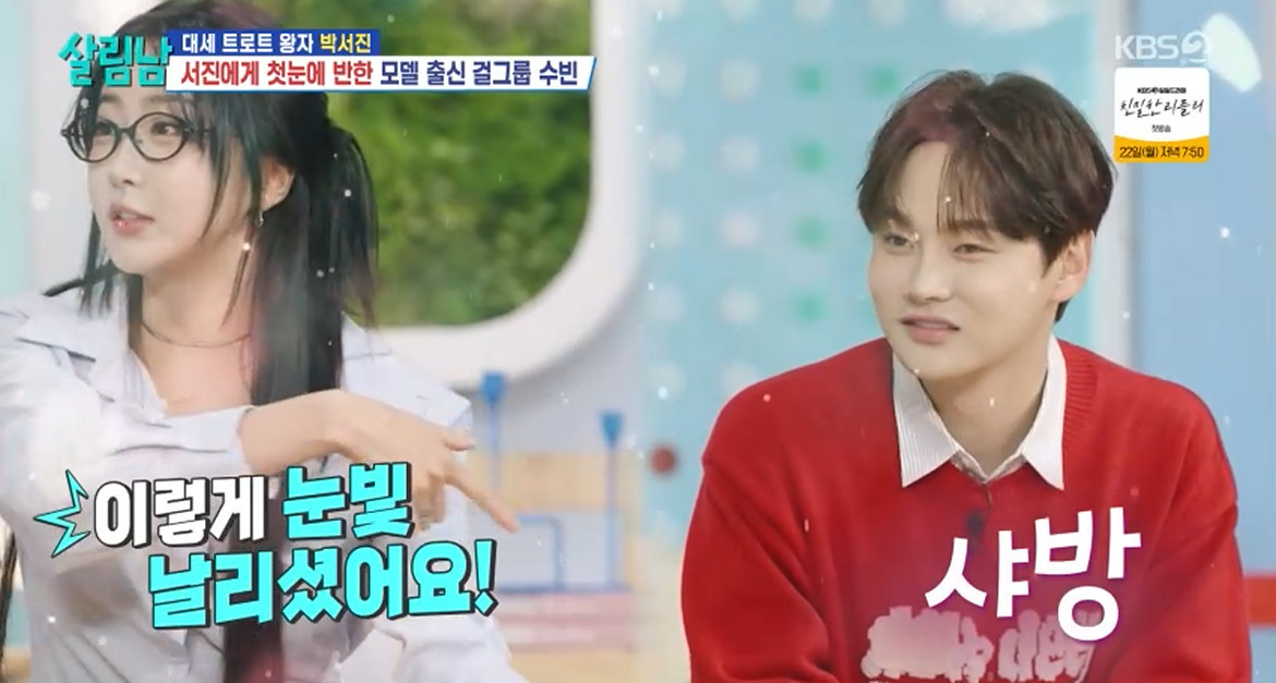 KBS2TV'살림하는남자들'20일방송KBS2TV'살림하는남자들'캡처(서울=뉴스1)황예지기자=걸그룹달샤벳달수빈이가수박서진에게첫눈에반했다.20일방송된KBS2TV'살림하는남자들'에서는부득이한사정으로불참한지상렬을대신해달수빈이출연했다.지상렬이달수빈을보낸이유에대해백지영은"서진이가94년생여자와잘맞는다"며두사람의러브라인을언급했다.실제로수빈은1994년생개띠로,박서진과한살차이다.방송에서수빈은박서진을보자마자"잘생기셨다.혹시DJ좋아하시냐?"며DJ활동을하는자신과공통점을찾는모습을보였다.이어"왜이렇게잘생겼어,방금보셨어요?"라며감탄했고,박서진의눈빛에"플러팅하신거죠?"라고되묻기도했다.이에박서진은"어디아프세요?"라고재치있게받아치며현장을웃음바다로만들었다[email protected]©뉴스1.Allrightsreserved.무단전재및재배포,AI학습이용금지.
