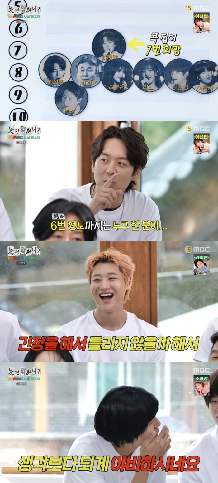 ‘놀면뭐하니’.사진IMBC주우재가하동균에게야비하다고했다.20일오후방송된MBC예능프로그램‘놀면뭐하니?’(연출김진용장우성장효종왕종석,작가최혜정)에서서울가요제참가자들은공연순서에관해얘기했다.이날방송에서유재석은“대부분중간순서를원해요.그런데최정훈씨가8번에서12번사이라고”라며의아함을제기했다.이에정훈은“2라고적었는데뒤에서‘후반부가좋지않냐’고해서귀가얇아서(적었다)”고밝혔다.또유재석은7번이라고적은하동균에의문을제기했다.이에하동균은“6번정도까지는누구한분이긴장해서틀리지않을까.그거에힘을좀받아서”라고솔직하게고백해웃음을자아냈다.이에주우재는“생각보다야비하다”며혀를내둘렀다.유재석은“경연이기때문에잘하시는분들도실수할수있다”며하동균마음을이해했다.MBC‘놀면뭐하니?’는매주토요일오후6시30분방송된다.[서예지스타투데이객원기자]Copyright©스타투데이.무단전재,재배포및AI학습이용금지
