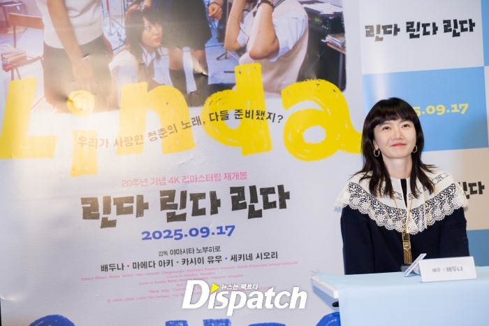 배두나"가장아름다웠던청춘시절담은작품"…배우4인방한자리영화'린다린다린다'주역들(서울=연합뉴스)강민지기자=12일서울강남구메가박스코엑스에서열린영화'린다린다린다'언론시사회및기자간담회에서감독과배우들이포즈를취하고있다.왼쪽부터배두나,마에다아키,카시이유우,세키네시오리,야마시타노부히로감독[email protected](서울=연합뉴스)정래원기자=배우배두나주연의일본영화'린다린다린다'가20년만에극장에서관객들을만난다.그린나래미디어에따르면'린다린다린다'는오는17일4K리마스터링버전으로재개봉한다.야마시타노부히로감독의2005년작품'린다린다린다'는고등학생시절의마지막을장식하는축제를준비하는여고생밴드의이야기를그린청춘영화다.얼떨결에밴드보컬을맡으며축제준비에합류하는한국인유학생'송'역할을배두나가연기하며마에다아키,가시이유우,세키네시오리와'4인방'의호흡을보여줬다.배두나는이날CGV용산아이파크몰에서열린기자간담회에서"제청춘의가장아름다웠던시절을담은작품"이라며"그래서인지영화를보면기분이몽글몽글하고이상해지는것같다"는소회를밝혔다.'린다린다린다'는한국과일본양국에서재개봉하며관련행사를진행중이다.배두나는최근일본도쿄에서열린재개봉행사에서출연배우들과오랜만에재회했던순간을떠올리며"만나자마자아이들처럼방방뛰었고,마치그시절로돌아간것같은기분이었다"고말했다.야마시타노부히로감독은"이영화를만들당시스물여덟살이던저에게'이런영화를만들다니참잘했다'라고칭찬해주고싶다"고했다.이날행사에는야마시타노부히로감독과배두나,마에다아키,가시이유우,세키네시오리등주연배우4인방이모두참석했다.마에다아키는"출연배우네명이함께모일수있어서기분이좋다"며"제가사랑하는작품이관객분들에게도사랑받는것을느껴행복하다"고말했다.영화'린다린다린다'속한장면[그린나래미디어제공.재판매및DB금지][email protected]▶제보는카톡okjeboCopyright©연합뉴스.무단전재-재배포,AI학습및활용금지