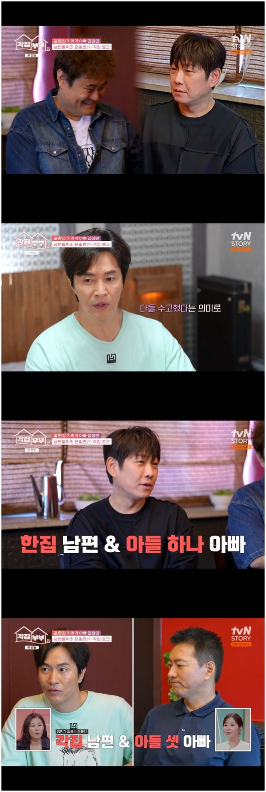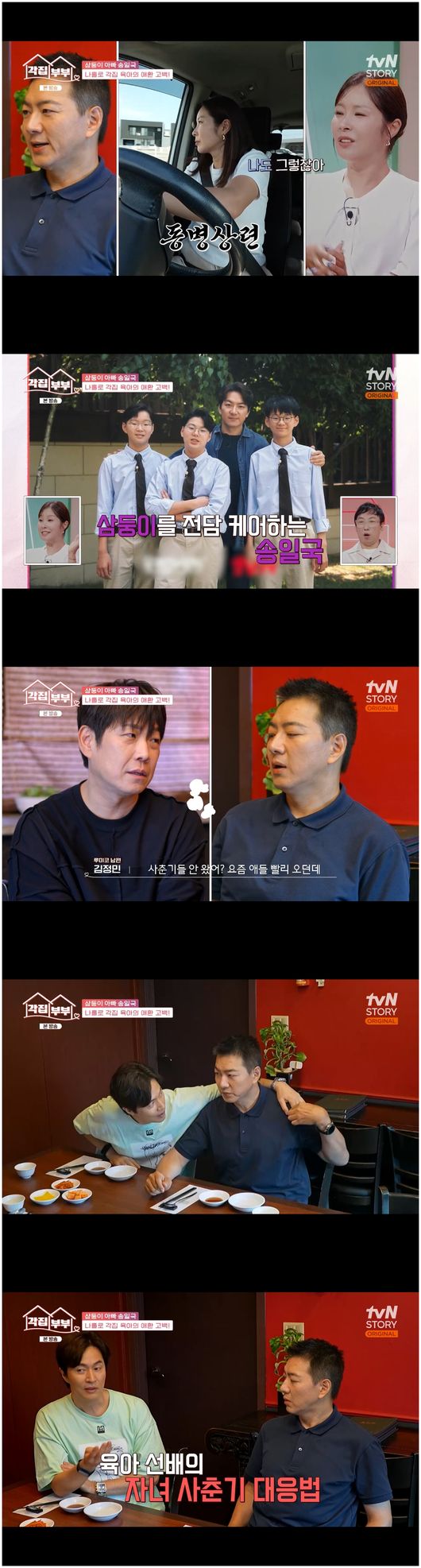 [OSEN=오세진기자]‘각집부부’배우송일국이어느덧중학생이된삼둥이들에대한고민을토로했다.11일방송한tvNSTORY‘각집부부’에서는뮤지컬'맘마미아!'주연인김정민,김진수,민윤기,송일국이식사자리를가졌다.이들은김진수를제외하고모두아들아빠였다.이중가장큰자녀가있는김정민은아빠들의본보기가됐다.김정민은“쌍둥이는아닌데셋이잖냐.운동을해서스포트라이트를받는애가따로있다.그래서집에서따로칭찬을안한다.셋이같이있을때는안한다”라며팁을전해송일국을감탄하게했다.현재송일국은판사아내가지방에있고,혼자삼둥이를케어를하며학원라이딩을하느라가장힘들다고전했다.김정민은“사춘기는안왔냐.5~6학년만돼도말투가거칠어진다”라며삼둥이에대해물었다.송일국은“삼둥이들은어깨동무만해도제팔을치운다”라면서아쉬움을토로했다.김정민은“조금만기다려.조금있으면다가올거야”라며송일국을다독였고,루미코는학원라이딩에급격히공감하며송일국과친구가되고싶어했다./[email protected][사진출처]tvNSTORY‘각집부부’Copyright©OSEN.무단전재및재배포금지.