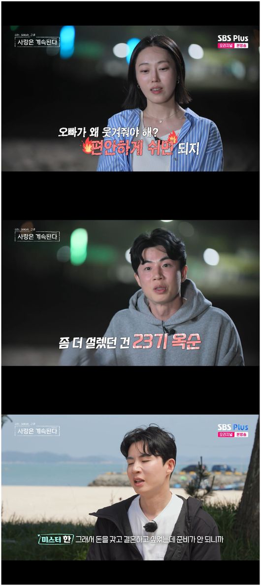 [OSEN=오세진기자]‘나는SOLO,그후사랑은계속된다’23기옥순이순수한마음으로미스터한을감동시켰다.11일방영한ENA,SBSPlus예능‘나는SOLO,그후사랑은계속된다’(이하‘나솔사계’)에서는슈퍼데이트를가지못했으나오히려출연자들의마음을돌려세운23기옥순의모습이그려졌다.24기옥순은슈퍼데이트를나가지못할뻔한것에흑화했다.미스터권은“나에게누군가가호감이있으면쓸테지만,그런사람도없으면룰을깨고안쓰겠다”라며23기옥순에게거절당한마음을이렇게표현했지만,24기옥순은“오빠저한테데이트권안썼으면써주세요”라며미스터권을흔들었다.데프콘은“난그런생각이든다.24기옥순은남자가필요한건지,미스터권이필요한건지.24기영식이‘나솔사계’를그렇게재미있게보고있다고하지않냐”라며중얼거렸다.24기옥순은“이번에는나에게남자들이다가오길바랐다”라며미스터권에게말했다.미스터권은“성숙하지?원래남자들은이렇다.성숙한남자들은돌다리를스무번은두드린다.열번밖에안두드렸는데”라면서옥순의제안을받아들였다.미스터한은11기영숙에게23기옥순과진지한대화후에마음을결정하겠다고말했다.그는이번선택으로최종선택까지밀고나갈것을외쳤다.23기옥순은“여기는서로좋은지를알아가는것같다.나는사랑하면바로결혼할수있다”라고말했다.그러나미스터한은“난부수적인게걸린다.20대후반부터는연애를거의못했다.금전적인문제가있었다.여자를만나려면돈이필요했으니까”라고말했고,23기옥순은“난부수적인것때문에못만난적은없었다”라고말했다.가령골프를치는것도미스터한은결혼을하면경제적인문제로포기를해야한다고생각했으며23기옥순은책임의문제로그만둬야한다는입장이었다.이렇게나다른두사람,특히미스터한은스스로헤쳐온길이꽤지난해보였다.미스터한은“난어렸을때부터월세를내며살았다.돈을모으기힘들었고,부모님도움이나두드려맞으면서,되게순해보여도고집도세고,여기까지왔다”라면서“그래서나는어떤파도가쳐도나혼자는이겨낼수있다.그런데23기옥순을내배에태워서너까지같이가자?그래서결혼이어렵다”라며현실을이야기했다.도리어23기옥순은언제나해맑았던미스터한의모습을떠올리고는눈물을흘렸다.미스터강은23기옥순에게자신은생각을복잡하게하지않는다고말했다.그말은확신을한다는뜻이었다.이말이23기옥순의마음을붙들어놓았으나,미스터한의솔직한태도는물론미스터권의23기옥순을잊지못한미련넘치는태도가23기옥순을흔드는듯했다.미스터권은24기옥순과의슈퍼데이트를나가면서도“머릿속에서23기옥순이비워지지않았다.한번은1:1로이야기를해보고싶었다”라고말했으며미스터한은“나는23기옥순에게직진하겠다”라고선포해본격적인사각관계를예고했다./[email protected][사진출처]ENA,SBSPlus예능‘나는SOLO,그후사랑은계속된다’Copyright©OSEN.무단전재및재배포금지.