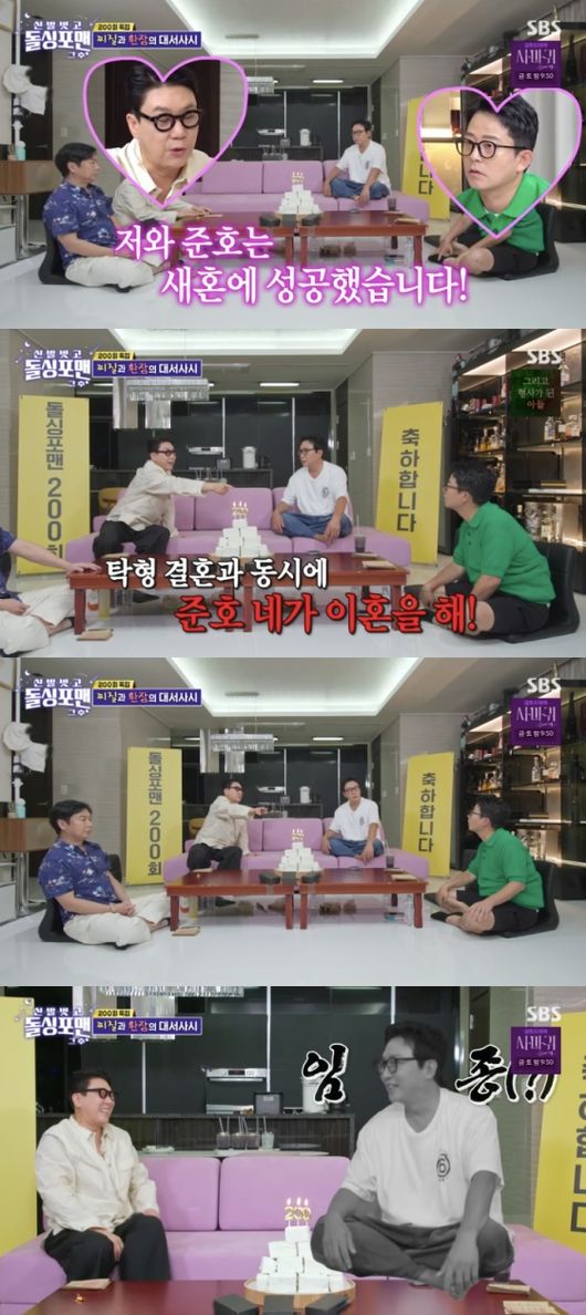 [OSEN=임혜영기자]이상민이김준호의이혼을예언했다.9일방송된SBS예능프로그램'신발벗고돌싱포맨그후’(이하돌싱포맨)에는현영,이현이,최홍만,심으뜸이게스트로출연했다.멤버들은‘돌싱포맨’200회를맞아자축했다.이상민은“200회동안여러분은뭐했냐.저와김준호는결혼했다”라고자랑했다.이상민은“우리의방향성을알려드리겠다.300회에임원희결혼하고400회에탁재훈이결혼을하는것이다.탁재훈결혼과동시에준호가이혼을해라”라고제안했다.이어이상민은“김준호가400회쯤되면3년산것이다.나는500회에이혼하고임원희는600회에이혼,700회때재훈이형임종”이라고덧붙여웃음을자아냈다./[email protected][사진]SBS예능프로그램'신발벗고돌싱포맨’Copyright©OSEN.무단전재및재배포금지.