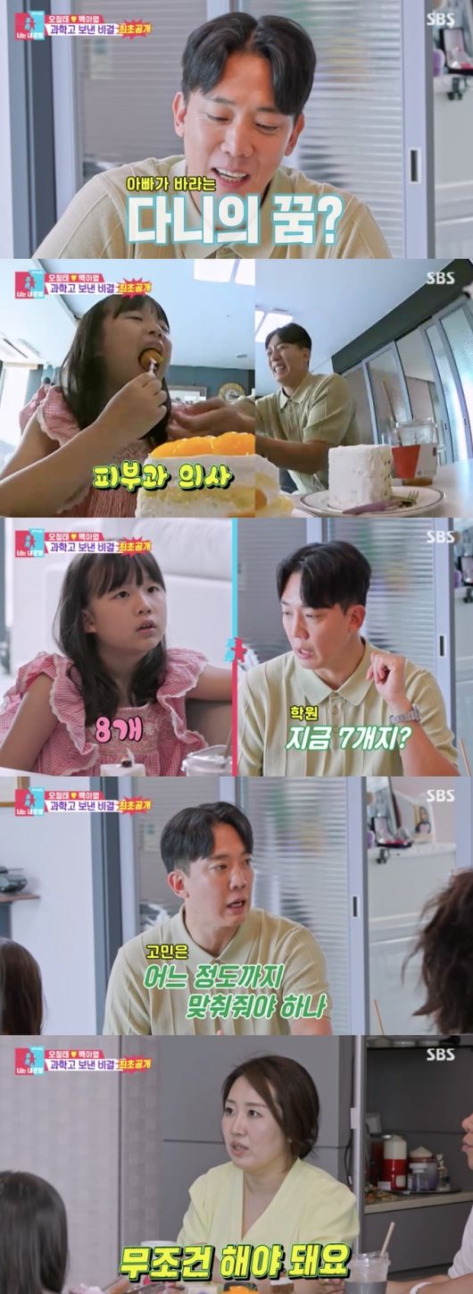 [SBS연예뉴스|김효정에디터]오정태부부가딸의과학고합격비결을공개했다.8일방송된SBS'동상이몽시즌2-너는내운명'(이하'동상이몽2')에서는오정태백아영부부가큰딸의과학고입학소식을전했다.이날방송에서는최상위급과학고에합격한오정태의큰딸정우가공부루틴을공개했다.한달치계획부터일주일단위로디테일한플래닝이가장먼저눈길을끌었다.이어책상4개를두고옮겨가며공부를하는철새공부법도관심을모았다.이에미미미누는"자리를바꾸며집중을유지하는방법이다"라고설명했다.또한정우는미미미누가최상의공부법이라고밝힌강의식공부법까지하며스스로의루틴대로공부를했다.오정태부부는큰딸에대해"저희가공부를너무안한부모라서다른부모들과비교가된다.둘다머리는좋지않으니까머리를닮은거같지는않다.그래도성실하고열심히하는것은닮은것같다.끈기있고노력많이하고최선을다하는그런걸닮았다"라고말했다.이에정우는부모님에게고마움을전하며늘든든하다고말했다.그리고부모님이조금시끄럽긴하지만조금참으면나쁘지않다며환하게웃었다.이날방송에서는딸을과학고에보낸엄마백아영의교육법도공개됐다.백아영은매사에두려움이없도록어렸을때부터다양한경험을하도록지원하는것부터무엇이든시작하면끝까지할수있게서포트를해준다고밝혔다.그리고사주계의입시컨설턴트를언급해모두를놀라게했다.백아영은"입시사주는신점이아니라통계학이다.사실처음에는예체능을시키려고사주를봤다.그런데얘는공부를할애라며공부를조지라고하더라.타고났다더라.수학머리가있다고해서초등학교4학년때현행을시작했다.그리고둘째에대해서도레이저눈빛이나오면서열공을한다고했는데정말어느날갑자기불이붙었다"라고말해눈길을끌었다.또한백아영은많은설명회에가며새로운것을한개씩은꼭건졌다며"그러면눈이떠진다.분별할수있는눈이"라고입시를위한정보싸움을게을리하지않는다고덧붙였다.그리고이날오정태부부는딸과함께입시컨설턴트를만나상담을받았다.전문가는정우의공부법에대해"이야기할필요가없다.완벽한친구"라며현재의목표인과학고조기졸업후서울대진학을목표로정진하라고조언했다.그리고딸을위한부모들의양육법에대해서도조언을아끼지않았다.또한현재영재고를목표로하는오정태의둘째딸에대해"가능성이충분하다.분명가능하다고본다.어떻게보면언니보다나은부분이있다"라고칭찬했다.Copyright©CopyrightⓒSBS.Allrightsreserved.무단전재,재배포및AI학습이용금지