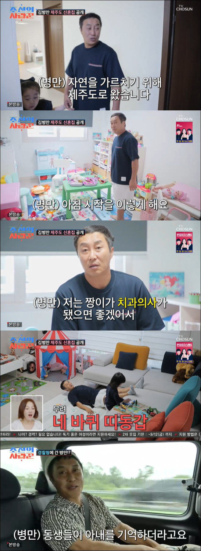 [스포츠조선닷컴이우주기자]'조선의사랑꾼'김병만이제주도신혼집을공개했다.8일방송된TV조선예능프로그램'조선의사랑꾼'에서는김병만의제주도신혼집이공개됐다.오는20일재혼을앞두고있는김병만은두아이와살고있는제주도신혼집을공개했다.김병만은"맹부삼천지교다.자연을가르치기위해제주도로왔다"며두아이를위해제주도에거주중이라고밝혔다.김병만은방하나를통째로아이들서재로양보했다.알록달록한방에서육아에집중하는김병만은"아침시작을이렇게한다.애들이(장난감)뒤집어놓고흩트려놓은걸저녁에치운다"며"예전에는해외나가면제물건들만샀는데이제모조리아이들걸산다.얘가선택하겠지만치과의사가됐으면좋겠어서의사놀이장난감도산다.말로는치과의사되겠다더라"라고흐뭇해했다.달인이지만육아는역시힘들었다.넘치는체력의아이들과놀아주다지쳐바닥에쓰러진김병만은"너희를못이기겠다.너희랑48살차이난다.네바퀴차이"라고토로했다.해양경찰홍보대사위촉식을위해경찰청에가기로한김병만.쌍둥이개그맨이상호,이상민도함께홍보대사로위촉됐다고.김병만은두사람과의인연에대해"'달인'팀이후로제일많이만난동생들"이라며"저희아내를처음만났을때도알던동생들이다.얘기하니까기억을다하더라.아이들얘기도하니까놀랐다"고밝혔다[email protected]©스포츠조선.무단전재및재배포금지.