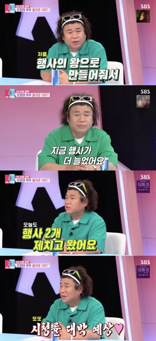 [OSEN=임혜영기자]개그맨오정태가한달에최대90개의행사를한다고해모두를놀라게했다.8일방송된SBS'동상이몽시즌2너는내운명'(이하'동상이몽')에는오정태의근황이그려졌다.'동상이몽'에1년만에돌아온오정태는바쁘게지내고있다며“'동상이몽'이저를행사의왕으로만들어줬다.행사가진짜많다.(지난번에)한달에행사60개였는데지금은달에최대90개한다”라는근황을전했다.또오정태는“너무바쁘다.못난이삼형제까지앨범을내서더욱더많아졌다.오늘도행사2개제치고왔다.시청률대박날것이다”라는자신감을드러냈다./[email protected][사진]SBS'동상이몽시즌2너는내운명'Copyright©OSEN.무단전재및재배포금지.