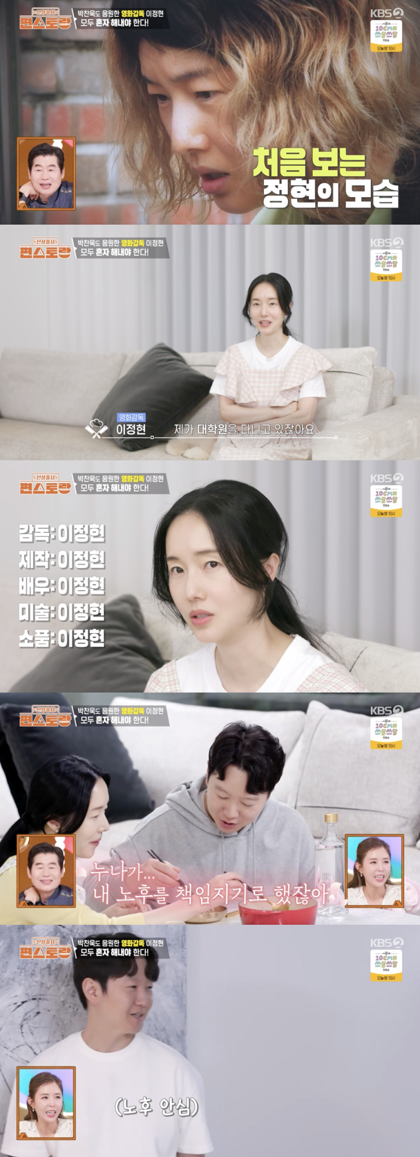[스타뉴스|정은채기자]/사진='편스토랑'방송화염캡쳐배우겸가수이정현이대학원졸업작품으로두번째독립영화를연출하며학업과창작,그리고가정까지모두병행했다.5일방송된KBS2TV'신상출시편스토랑'에서는이정현이진지한표정으로두번째독립영화를연출하는과정이공개됐다.이정현이준비중인이번작품은대학원졸업을위한졸업작품으로,이정현은학업과창작을동시에병행하며열정을쏟고있었다.그는제작과정에대해"이번에도지난작품과마찬가지로감독,제작,배우,미술,소품,의상까지제가챙긴다.그리고일인다역을한다"라고말해모두를놀라게했다.단순한연출을넘어영화전반의모든영역을직접책임지며진정성을드러낸것.이정현의남편또한든든한내조자로활약했다.그는아내의촬영준비를위해대본을프린트하는등스태프처럼세심한도움을아끼지않았다.이어"졸업후영화제같은거에서수상도할수있냐"라며은근한압박(?)을건네웃음을자아냈다.나아가"이거다음에장편으로또할거지?"라고덧붙이며자신의노후를아내의영화활동에기대는모습을보여훈훈하면서도유쾌한분위기를더했다.정은채기자[email protected]©스타뉴스&starnewskorea.com,무단전재및재배포금지