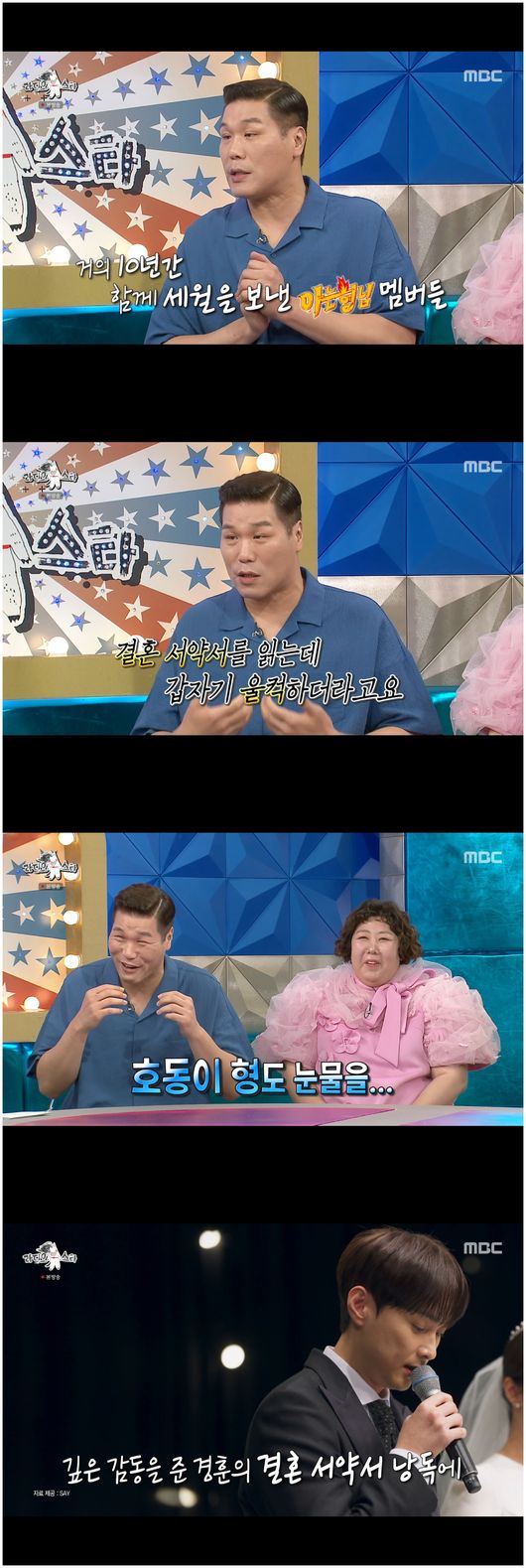 '라디오스타'3일방송MBC'라디오스타'캡처MBC'라디오스타'캡처(서울=뉴스1)박하나기자=방송인서장훈이'라디오스타'에서눈물이많아진근황을밝혔다.3일오후방송된MBC예능프로그램'라디오스타'에서는'올덩치프로젝트'특집으로꾸며져서장훈,신기루,신동,나선욱이출연해입담을뽐냈다.요즘부쩍눈물이많아졌다는서장훈은"원래도있었는데,더감성적으로변한것같다"라며드라마'폭싹속았수다'를보고누군가볼까봐창피할정도로울었다고고백해시선을모았다.더불어서장훈은방송에서도틈나는대로울었다고밝혔지만,함께'동상이몽2'를진행중인김구라가서장훈의눈물을인정하지않아웃음을안겼다.이에신동이"얼마전,민경훈형결혼식때서약서를읽는데갑자기눈물을흘렸다"라며서장훈이눈물을흘린일화를전했다.서장훈은"많이울었다"라며10년을함께한민경훈의결혼이대견했다고전했다.이어서장훈은"민경훈이서약서를읽는데괜히갑자기울컥해서눈물이저도모르게나왔고,옆을보는데호동이형도눈물을흘렸다"라고해눈길을끌었다.한편,MBC'라디오스타'는어디로튈지모르는촌철살인의입담으로게스트들을무장해제시켜진짜이야기를끄집어내는독보적토크쇼프로그램으로매주수요일오후10시30분에방송된다[email protected]©뉴스1.Allrightsreserved.무단전재및재배포,AI학습이용금지.