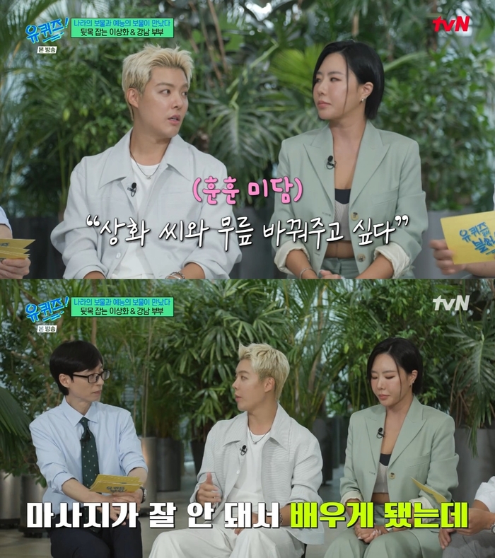 ‘유퀴즈온더블럭’.사진ItvN‘유퀴즈온더블럭’방송캡처가수겸방송인강남이아내이상화를위해스포츠마사지자격증을땄다고밝혔다.3일방송된tvN‘유퀴즈온더블럭’에는강남,이상화부부가게스트로출연했다.이날유재석은“이상화가무릎때문에힘들어할때강남이‘내무릎이랑바꿔주고싶다’라고했다”며강남의미담을전했다.강남은“‘차라리내무릎을가져가서이상화가열심히해서나라를빛내고나는집에서쉬면얼마나좋을까’라는생각이었다.그런데그걸대중이너무따뜻하게받아줬다”고너스레를떨었다.강남은아내이상화를위해스포츠마사지자격증을땄다고.강남은“마사지를안배운상태로몇번했는데잘안돼서배우게됐다”고말했다.이어“옛날엔‘내가마사지해주겠다’라고했는데요새는아침에일어나면발이얼굴에있다.주무르라고”라고해웃음을자아냈다.한편‘유퀴즈온더블럭’은매주수요일오후8시45분방송된다.[이세빈스타투데이객원기자]Copyright©스타투데이.무단전재,재배포및AI학습이용금지