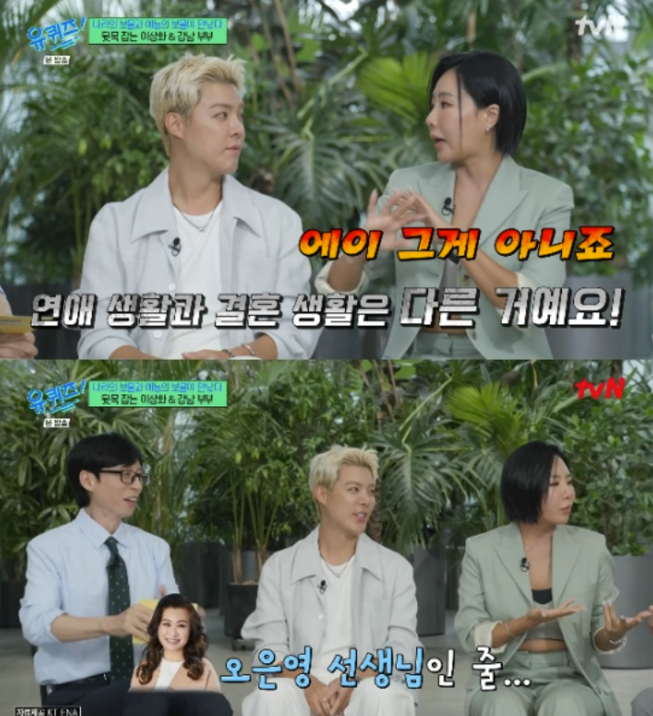 ▲사진|'유퀴즈'방송화면[스포티비뉴스=배선영기자]결혼7년차이상화와강남부부가결혼전부모님의반대에부딪힌사연이공개됐다.3일방송된tvN'유퀴즈온더블럭'(이하유퀴즈)에서는이상화와강남부부가출연했다.이날유재석은"두분의열애소식이알려지고,'이상화가강남을?''이상화를사로잡은강남의매력이뭘까?'라는반응이많았다"라고말했다.이에이상화는남편강남의매력에대해"장난기속에숨어진진중함이있다.대화를할때진심이통했고,무엇보다어른들한테예의가너무발랐다"고전했다.또강남은"(이상화는)피곤해서쓰러져서잘때가장예쁘다.평소에너무완벽한모습이니까그런모습을보면귀엽다"고말했다.이날강남은이상화에게장난을치면서도극존칭을쓰며"상화씨가포스와아우라가있어서극존칭을쓰게된다.연애때는이정도는아니었는데"라고했다.이상화는"연애와결혼은다르다.결혼을했으면미래를함께생각해야하지않냐.그래서이남자가주체못했던장난기를결혼해서는절제를해야한다고생각한다"고말했다.또두사람은결혼전'정글의법칙'이라는프로그램을만나연인으로발전했다며,당시열애사실을들킨계기가강남의반려견때문이었다는에피소드를전했다.강남은"저희집에트로트선배님들이오신날우리강북이(반려견)가누가오면막짖었는데상화씨를보고는애교를부렸다"라고말했고,이상화역시"엄청당황했다.어제도봤었는데'너가말로만듣던강북이구나~'라고했다"며웃었다.<저작권자ⓒSPOTVNEWS.무단전재및재배포금지>Copyright©스포티비뉴스.무단전재및재배포금지.