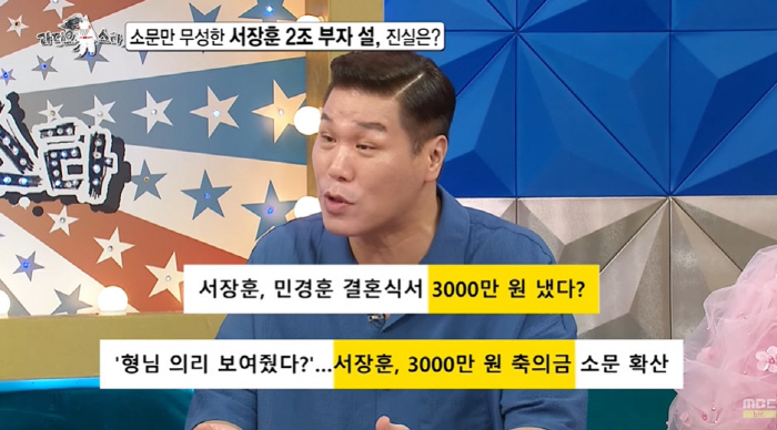 [스포츠조선닷컴정안지기자]방송인서장훈이2조설루머에억울함을드러냈다.3일MBC'라디오스타'측은"소문만무성한서장훈2조부자설,진실은?"이라면서선공개했다.영상속서장훈은김희철이키워낸2조재산설에대해이야기했다.서장훈은"처음에는2조가아니었다.2천억에서3천억,5천억,1조,2조까지불어났다"면서"2조이야기를계속하니까내가볼때100명중5명까지는믿는것같다"며재산루머를언급했다.이에신동은"더많이믿는다"고했고,김국진은"나도믿는다"며웃었다.서장훈은"문제는요즘은기사가나면앞에무조건'2조거인'이붙는다.기사마다'2조거인'으로적히니'이정도면진짜아니냐'라면서회사로'돈빌려달라'면서편지를보내는사람이많다"며"내가뭘해서2조를벌수있냐"며하소연했다.또한서장훈은"희철이가아무생각없이내가민경훈결혼식에축의금을3000만원냈다고하더라"면서"인터넷에믿는사람들이많다"면서끝나지않은재산루머에억울하다는표정을지었다.이어그는"심지어더말도안되는점은내가3천만원냈는데,(강)호동이형은2천만원냈다고하더라"며"이런얘기를믿는사람이생각보다많다"고했다.그러자절친인김구라는"서장훈돈많다.그리고축의금100만원이상한다.그냥끝"이라며정리에나섰다.이에서장훈은"형이정리하면아무도그렇게생각하는사람이없는거냐"고했고,김구라는"그렇다.내가맨날이야기하고다니겠다"고해웃음을안겼다.한편서장훈은농구선수은퇴후예능에본격도전해'미운우리새끼','아는형님','무엇이든물어보살'등굵직한프로그램에서활약하며명실상부한'예능황제'로자리매김했다.냉철한분석과솔직한화법,그리고인간적인매력으로세대를아우르는인기를얻으며방송가대표MC반열에오른것.최근에는'이혼숙려캠프'등의예능에서호통도치지만훈훈한조언자이자인간적인모습도보여주고있다.서장훈은"방송에서화내고직설을하는역할탓에성대결절진단을받았다"라며"병원에서'말을줄이라'는권고까지받았다"라고고백한다.이어치료를위해집에서이틀간'침묵'하며지냈다고해모두를놀라게한다.이에김구라는사석에서말을줄여야한다고말해웃음을자아낸다[email protected]©스포츠조선.무단전재및재배포금지.