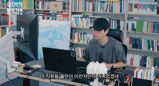 (엑스포츠뉴스장주원기자)박정민이'악덕출판사대표'오해에반박했다.지난8월29일유튜브채널'치과의사매직박'에서는'배우박정민출판사무제쳐들어가서맞짱뜸ㅋㅋㅋㅋ'영상이게재됐다.영상에서치과의사매직박은배우박정민이대표로운영하는출판사'무제'에방문해박정민과이야기를나누는시간을가졌다.회사를방문한매직박은아직오지않은박정민을기다리며출판사직원들과이야기를나눴다."요즘도책많이팔리냐"는매직박의질문에출판사직원은"판매량이많이떨어졌다"고힘빠진목소리로전했다.매직박은직원에게"대표박정민은어떤사람이냐.까놓고말해봐라"라며박정민의이야기를시작했다.직원은"휴가를갔는데도계속업무연락을..."이라고말하며말끝을흐렸다.더하여직원은"회사에들어오고대표님과연락을안한날이없었다.그래서서로눈치좀보죠?라고말했다"고전했다.이에매직박은휴가때도못살게구는박정민을구박하다멈추고는"요즘젊은친구들이이래요"라며'꼰대미'를발산했다.개선할점을묻는매직박의질문에직원은"물이회사에구비가안돼있다"며충격적인발언을했다.이에매직박에게직원은"물을안사준다고요?"라며놀람을금치못했고,직원은"물이없어서개인카드로물을사온적이있다.근데다음주에정수기설치해주시기로하셨다"며기쁨을드러냈다.한창직원과이야기를나누던중,회사에도착한박정민에게매직박은"회사에물이없어요?이사님이개인카드로물을사왔다"며아까충격적인개선점에대해언급했다.이에박정민은"우리정수기시켰다.딱한번그랬고내가매번내카드로물사고커피사줬다"라고하며내부고발에반발하며웃음을줬다.이야기를마치고자리에앉아대표박정민의업무를구경하던매직박은대뜸"야동을여기서봐도상관없어요?"라며박정민의컴퓨터를가르켰다.이에박정민은"소리만꺼놓으면되죠"라고천연덕스럽게말해현장의사람들을웃게만들었다.박정민은연기와출판사에대해"이제연기를쉬고출판사에집중하며궤도에올려놓을때까지열심히하겠다.출판사는어느정도궤도에올라온것같다"고밝히며출판사를향한사랑을드러냈다.한편,박정민은11일개봉예정인영화'얼굴'의주인공임동화·임영규로출연하며1인2역연기에도전한다.사진=유튜브'치과의사매직박'장주원기자[email protected]©엑스포츠뉴스.무단전재및재배포금지.