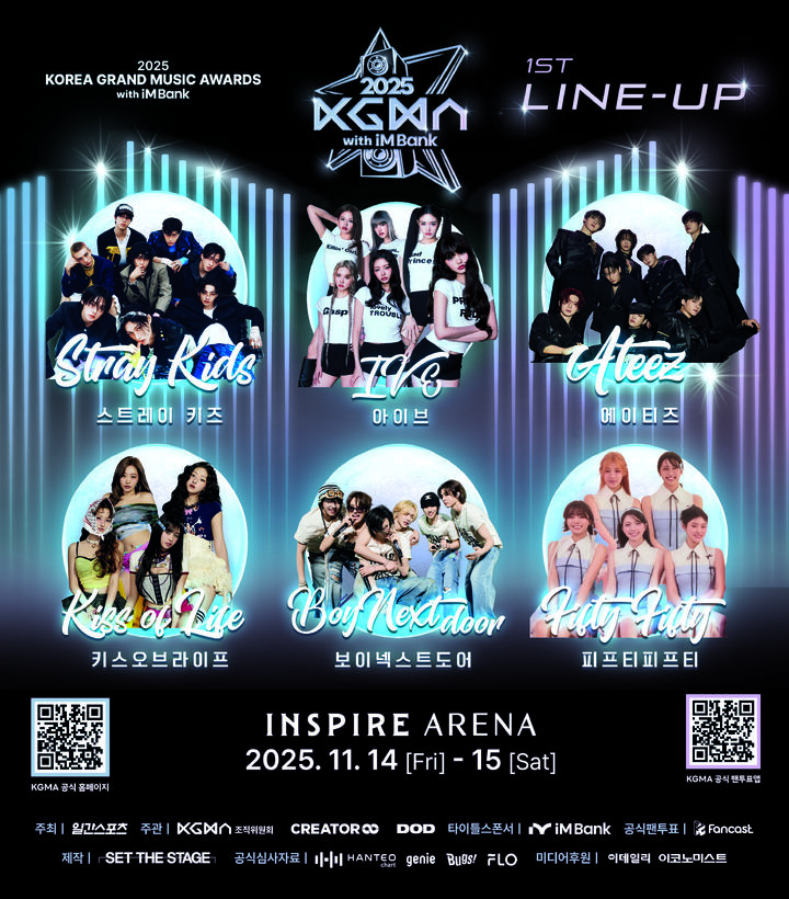 [서울=뉴시스]'2025KGMA'라인업.(사진=일간스포츠,각소속사제공)[email protected]*재판매및DB금지[서울=뉴시스]이재훈기자=K-팝그룹'스트레이키즈'(스키즈),'에이티즈','아이브','보이넥스트도어'(보넥도),'키스오브라이프'(키오프),'피프티피프티'가엔터테인먼트·스포츠신문일간스포츠'코리아그랜드뮤직어워즈'(KGMA)에출연한다.3일KGMA조직위원회에따르면,이들은오는11월14~15일인천광역시중구운서동인스파이어아레나에서열리는'제2회코리아그랜드뮤직어워즈'(2025KGMA)의1차라인업에포함됐다.스트레이키즈는미국빌보드메인앨범차트'빌보드200'에서K팝아티스트최다기록인7연속1위금자탑을세웠다.에이티즈는지난6월발표한미니12집'골든아워:파트3'타이틀곡'레몬드롭'과'인유어판타지에디션'동명의타이틀곡까지두곡을연달아빌보드'핫100'에진입시키며글로벌인기를입증했다.아이브는최근미니4집'아이브시크릿'으로존재감을확인중이며,보이넥스트도어는올해초'오늘만아이러브유'를통해음원파워를과시했다.키스오브라이프는세련된K-팝으로주목받고있고,피프티피프티는하모니와단단한퍼포먼스가특징이다.KGMA조직위원회는2차와3차라인업도순차적으로발표할예정이다.이번시상식MC로는레드벨벳아이린,키스오브라이프나띠가각각14일과15일나선다.지난해에이어배우남지현이이틀연속MC를맡는다.KGMA는일간스포츠(이데일리M)가주최하고KGMA조직위원회와크리에이터링,디오디가공동주관한다.KGMA음원및음반데이터는한터차트,지니뮤직,플로,벅스가제공하며공식팬투표는팬캐스트앱을통해진행된다.☞공감언론뉴시스[email protected]©뉴시스.무단전재및재배포금지.