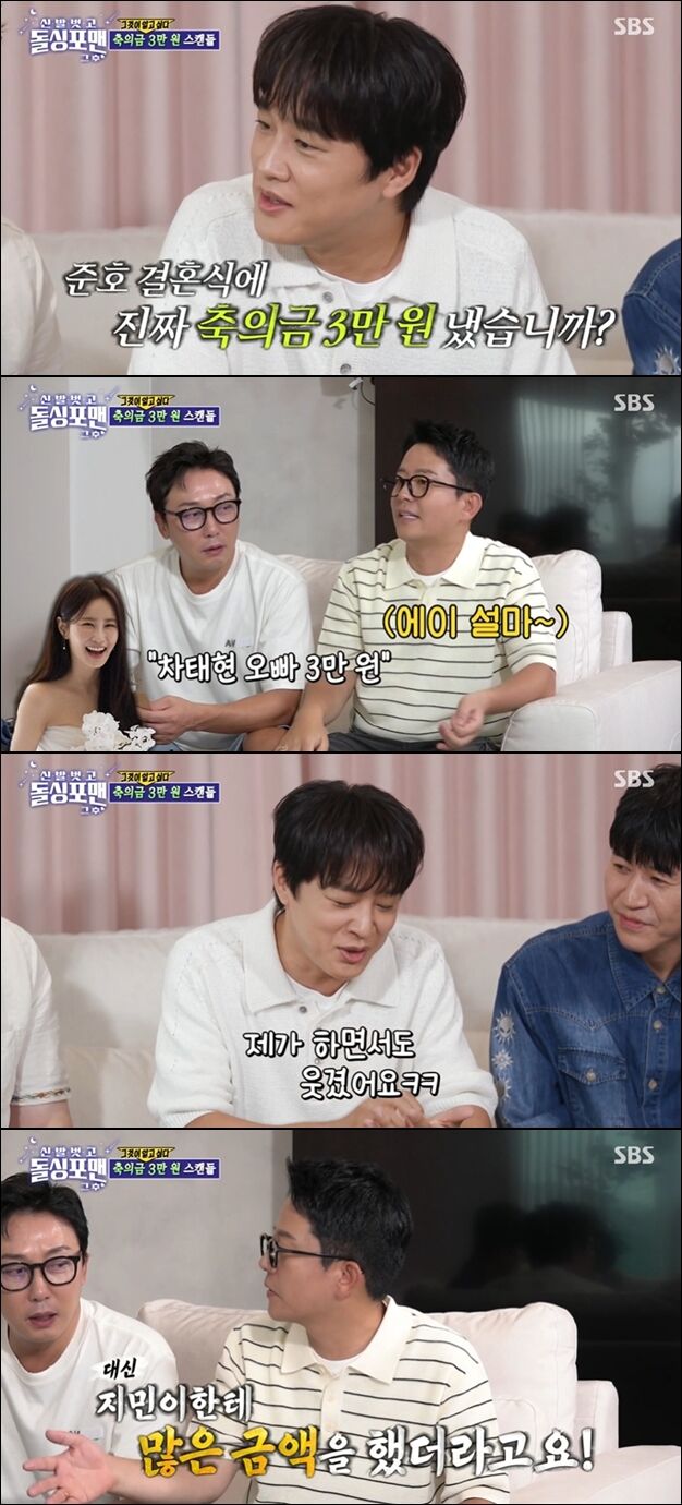[SBS연예뉴스|강선애기자]배우차태현이절친한개그맨김준호의결혼식에축의금3만원을낸이유를밝혔다.지난2일방송된SBS'신발벗고돌싱포맨'에는차태현,가수김종민,핀란드출신방송인레오란타가게스트로출연했다.이날이상민은팩트체크를해야한다면서차태현에게"김준호결혼식에진짜축의금3만원냈나"라고물었다.그러자김준호는"축의금확인하면서옆에서김지민이(금액을)불렀다.'차태현3만원'이라하더라.봉투를보니3만원이었다"고거들었다.이에다들차태현이무슨이유로절친한김준호에게3만원의금액을축의금으로냈는지궁금해했다.차태현은"결혼식가는길에갑자기그런생각이들었다.결혼식이힘들지않나.그래서내가,나중에이거확인할때한번웃으라고한거다.내가하면서도웃겼다"고설명했다.김준호에게낸'축의금3만원'은일종의이벤트였던것.이에김준호는"(차태현이)지민이한테많은금액을했더라.지민이가'차태현은내식구'라고한다"고설명했다.차태현은"종민이결혼할때도,준호형결혼할때도,이상하게울컥하더라.좀신기했다"며절친한김종민,김준호의결혼에울컥했던감정을털어놨다.하지만이내"정말못갈것같던사람이,다시는그럴일이없을것같던사람이(결혼을해서)"라고답해주변의웃음을자아냈다.이어차태현은"탁재훈형결혼식에가면난울것같다"며"다시는못갈줄알았는데"라고덧붙여탁재훈을당황하게했다.강선애기자[email protected]©CopyrightⓒSBS.Allrightsreserved.무단전재,재배포및AI학습이용금지