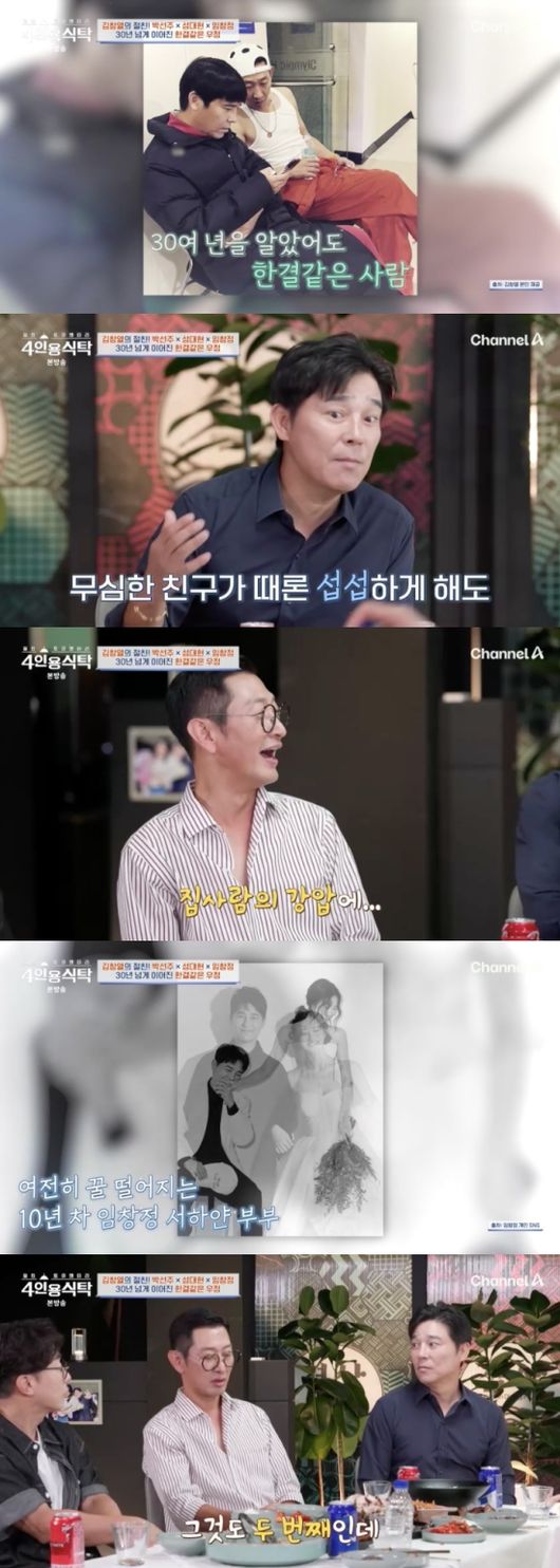 [OSEN=임혜영기자]임창정이리마인드웨딩사진에대해이야기를나누었다.1일방송된채널A‘절친토큐멘터리–4인용식탁’(이하4인용식탁)에는가수김창열이출연,박선주와성대현을초대해이야기를나누었다.이날촬영장엔임창정이깜짝손님으로등장했다.김창열은“창정이랑한강둔치에서둘이돗자리깔고맥주를한잔했다.둘다기분좋게취해서옛날얘기도했다.가족얘기하다가울컥올라온것이다”라며임창정과속내를터놓고지낼만큼가까운사이라고밝혔다.임창정은“창열이랑부자지간느낌이다.내가아들같다.정말로늘그자리에있다.나한테서운할만도한데.가끔지적하지만그걸로끝이다”라고덧붙였다.박경림은임창정에게최근10주년리마인드웨딩사진을촬영한것을언급했고,임창정은“집사람의강압에”라며너스레를떨었다.김창렬은“생각보다사진이잘나왔다.그것도두번째인데”라며매콤한입담을뽐냈다.임창정은“오래봐왔던결혼사진을교체하며새기분을냈다”라고첨언했다.모두가이혼없이무탈한결혼생활을자축하는가운데임창정은삐친듯한표정을지어웃음을자아냈다./[email protected][사진]채널A‘절친토큐멘터리–4인용식탁’Copyright©OSEN.무단전재및재배포금지.