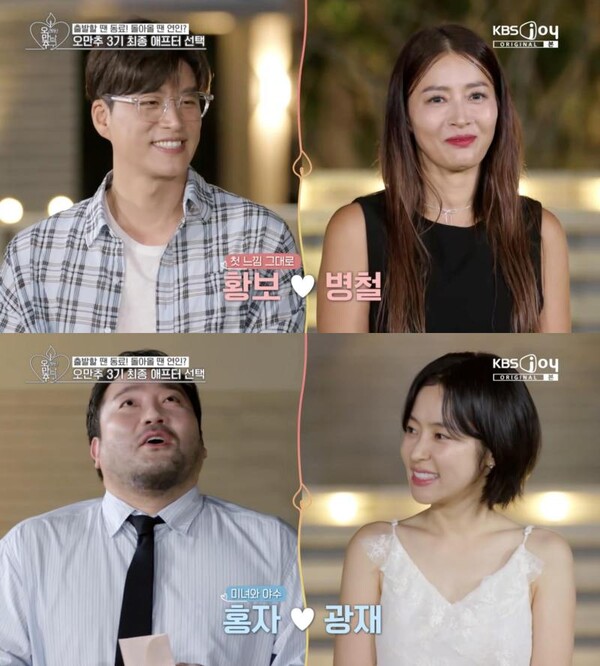 ⓒKBS2'오래된만남추구'[스포츠한국신영선기자]'오래된만남추구'3기에서두커플이탄생했다.1일방송된KBS2'오래된만남추구'에서는3기의최종애프터선택결과가공개됐다.박광재는"2기나오고나서후회를많이했다.조금만더현명하고잘했다면하는아쉬움이있었다.이번에3기에나와서는정말후회하지않으려고노력많이했다.그분을본순간느꼈던그마음그대로가겠다"며홍자를선택했다.그는"첫인상부터너무맘에들었고얘기하는것도맘에들었고저에대한배려랑사실싫어할만한부분이단하나도없었다"고이유를밝혔다.홍자는"함께있을때편안하고시간이빨리가는것같다.알아보고싶은아쉬움인가생각했다"며박광재를선택해커플이됐다.이켠은"커플이된건축하하지만제입장에서는안타까운상황"이라며선택을하지않았다.다음순서인송병철은"취미라든가이야기를같이할수있는사람을찾았다.그분과함께이야기나눴을때편했고같이하면재밌는일들이많이일어날것같아서더알아보고싶고그분과제대로된데이트를하고싶다"며황보를선택했다.송병철과이규한을두고고민했던황보는송병철을선택해두번째커플이됐다.장소연은이미홍자와커플이된박광재의초에불을붙이면서"친구로서불을밝히고싶다"고말했다.ⓒKBS2'오래된만남추구'솔비는"커플이되는것보다얼마나초앞에서용기를내느냐가중요한것같다"며이규한을선택했다.솔비의선택을받은이규한은"참이상한프로그램이다.처음보지만오랫동안봐온것같은관계,친구가될수있다는믿음을줘서감사하다.솔비는너무나고맙고팬이었다.우리황보,여기와서처음으로절울컥하게한여자다.베스트프렌드가돼준다고해서감사하다"는말을남긴채부담을주고싶지않다며선택을포기했다.솔비는이규한을향해"못났다"고말했고,황보도"그래,못났다"라고동의했다.애프터선택이끝나고송병철과황보는자연스럽게손을잡고귓속말을하며화기애애한분위기를자아냈다.박광재는"병철이형,그만좀웃어요"라고놀렸다.스포츠한국신영선기자[email protected]©스포츠한국.무단전재및재배포금지.