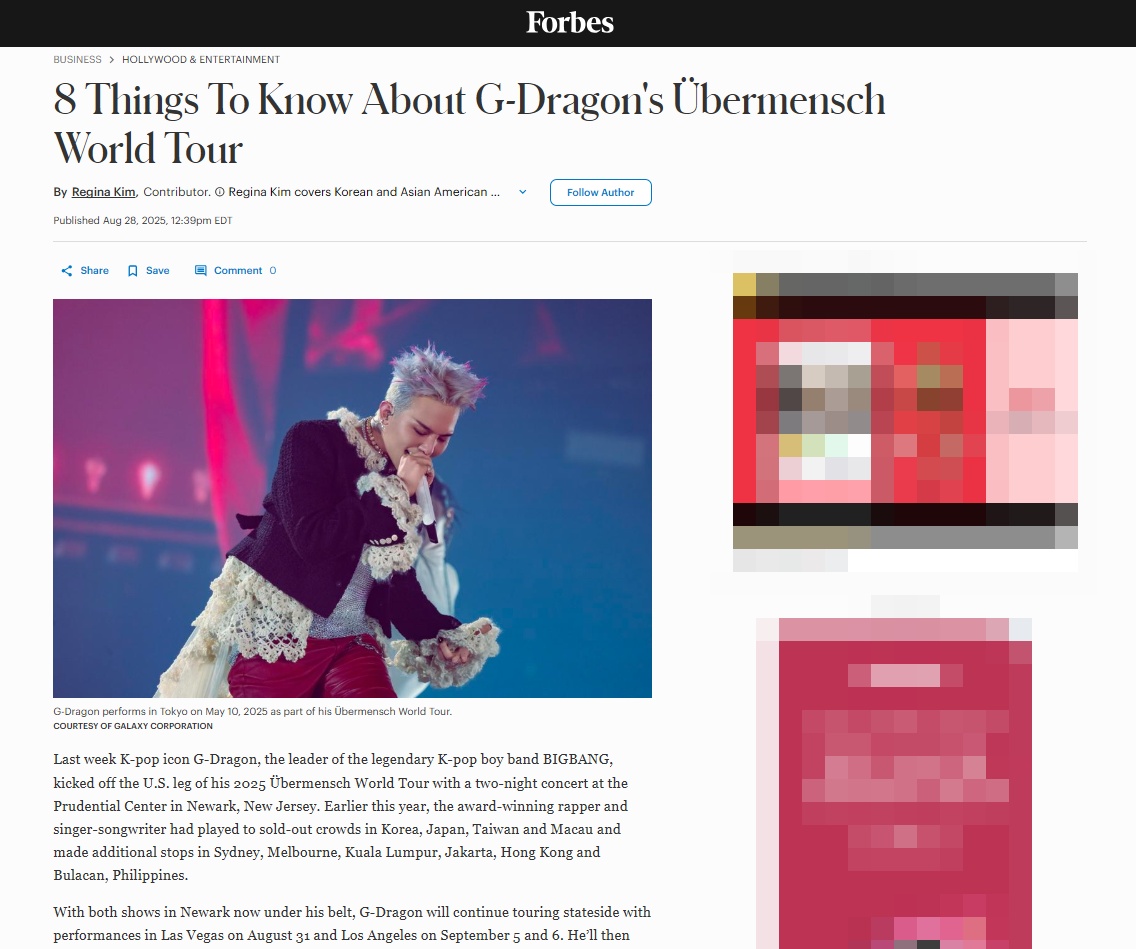 사진=포브스캡처/SNS가수G-DRAGON(지드래곤)의월드투어에대해미국유력매체포브스가집중조명하며그의글로벌영향력을다시확인시켰다.지드래곤은지난3월한국공연을시작으로도쿄,불라칸,오사카,마카오,시드니,멜버른,타이베이,쿠알라룸푸르,자카르타,홍콩등아시아·태평양투어를성료한데이어,8월22일과23일뉴어크공연을시작으로미국투어에돌입했다.사진=포브스캡처/SNS포브스는"이번투어는오랜기간G-DRAGON을지지해온팬들에게특히특별한의미를지닌다.그의경력과영향력에익숙하지않은신규K-팝팬들에게는한국을대표하는영향력있는K-팝아티스트의카리스마와무대매너를직접경험할수있는특별한기회가될것"이라며극찬을쏟아냈다.이어포브스는"'K-팝의왕'이8년만에더큰자아인식과성숙함을지닌채돌아왔고,이제자신만의방식으로성공을정의하고있음을분명히보여주었다"며AI엔터테크기업갤럭시코퍼레이션의다양한테크기술이더해진G-DRAGON의환상적인공연연출과프로페셔널한퍼포먼스등에대한찬사를아끼지않았다.한편지드래곤은오는31일(현지시간)라스베이거스공연을이어가며,이후LA와프랑스파리에서도'G-DRAGON2025WORLDTOUR[Übermensch]'를진행한다.YTNstar곽현수([email protected])*YTNstar에서는연예인및연예계종사자들과관련된제보를받습니다[email protected]로언제든연락주시기바랍니다.감사합니다.[저작권자(c)YTN무단전재,재배포및AI데이터활용금지]Copyright©YTN.무단전재및재배포금지.