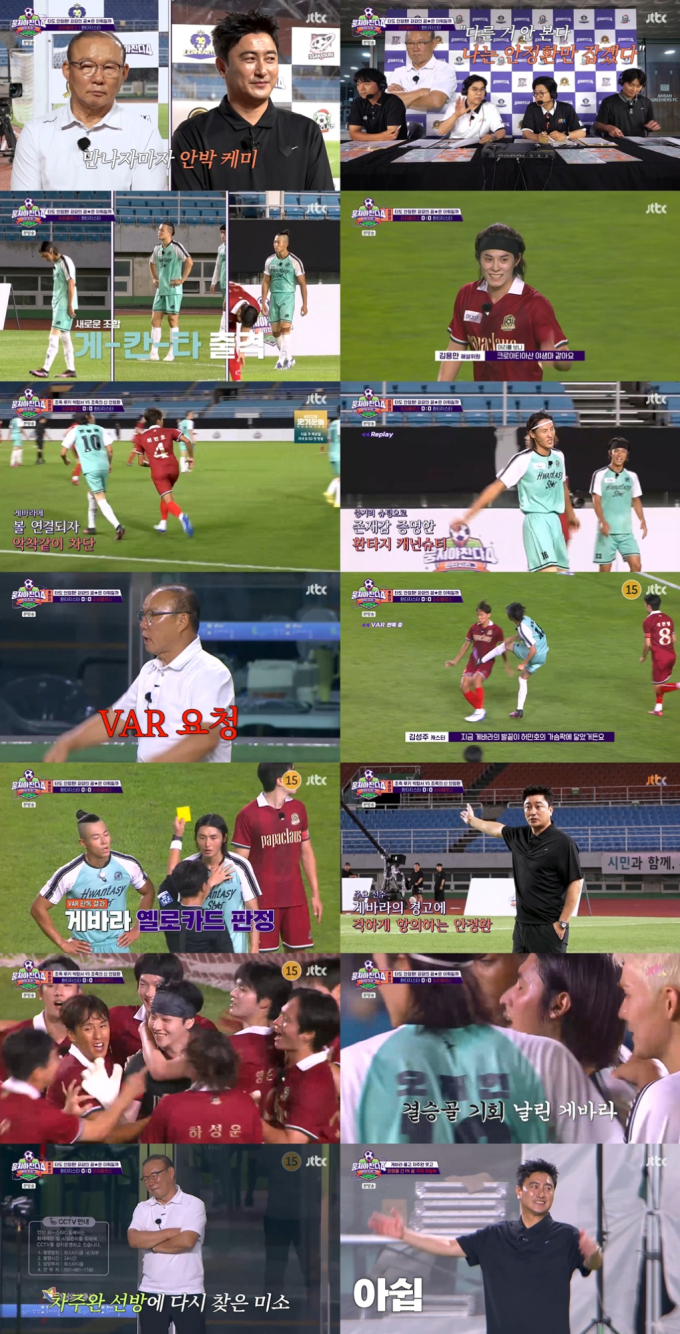 ‘뭉쳐야찬다4’박항서안정환무승부(사진:JTBC)'뭉쳐야찬다4'박항서감독이안정환감독을상대로연패에서탈출했다.8월31일방송된JTBC대표스포츠예능‘뭉쳐야찬다4’(이하‘뭉찬4’)22회에서는안정환감독의‘FC환타지스타’와박항서감독이이끄는‘FC파파클로스’와맞붙었다.양팀은끝까지물러서지않는혈투를펼친끝에0:0무승부로마무리됐다.손에땀을쥐게하는명승부에시청률도응답하며종편,케이블을포함한비지상파채널동시간대1위를기록했다.이날박항서감독은경기전부터“타도안정환”을외치며복수심을불태웠다.앞선두번의경기에서연속패배를맛본박항서는철저한비디오분석과상대팀을꿰뚫는전술로승리를노렸다.특히그는‘FC환타지스타’의캡틴이자에이스인류은규가직전경기레드카드로인해출장못하는찬스를살려,또다른에이스인게바라만막는‘게바라봉쇄작전’을세웠다.‘게바라봉쇄작전’을수행할선수는바로‘뭉찬3’에서게바라와함께호흡을맞췄던허민호.박항서는허민호에게“게바라가어딜가든쫓아가라”며전담마크를지시했다.또한부상으로결장하는독일세미프로선수출신신우재를대신해,크로아티아세미프로선수출신배우김루이가대체선수로합류해활약을예고했다.앞서‘FC라이온하츠’와의경기에서3:1로대패했던‘FC환타지스타’도지옥의체력훈련을통해담금질하며이번경기를준비했다.또한안정환감독은컨디션이좋은호주타잔을류은규대체카드로선택하며‘게-칸-타(게바라-칸-호주타잔)’공격라인을가동했다.전반전은치열한공방전속에서도득점없이흘러갔다.‘FC파파클로스’는김루이의자신감넘치는논스톱슈팅과신현수의헤더찬스를만들었지만,마무리가아쉬웠다.‘FC환타지스타’는허민호에게꽁꽁묶인게바라를대신해오재현과호주타잔이공격을전개했으나아쉽게도골망을흔들진못했다.그중호주타잔의슈팅이빗나갈때는중계진이“류은규였다면유효슈팅이됐을것같다”고말해류은규의공백을짚었다.후반전에서는경기가더욱뜨거워졌다.이런가운데허민호가게바라와몸싸움도중반칙을선언받자,박항서감독은즉각VAR을요청하며“게바라의파울아니냐”고강력히항의했다.결과적으로게바라가경고를받으며‘FC파파클로스’벤치가환호했고,안정환감독은“이게무슨판정이냐”며격앙된반응을보였다.경기막판,운명같은장면이찾아왔다.수비수를뚫고돌파하던게바라가허민호를상대로페널티킥을얻어낸것.모두가‘FC환타지스타’의승리를예상하는순간,‘FC파파클로스’의골키퍼차주완이이를막아내며기적같은순간을만들어냈다.그는키커의시선을흔드는심리전끝에환상적인선방을선보였고,이를본‘FC파파클로스’선수들은폭발적인함성으로기뻐했다.경기는0:0으로종료됐지만,‘FC파파클로스’에게그의미는결코무승부에그치지않았다.에이스게바라를완전히지워버린허민호,투혼의수비진,그리고‘극장선방’으로팀을구한차주완까지.선수모두가제몫을다하며“파파클로스는더이상약팀이아니다”라는메시지를남겼다.경기후이찬형은“(‘FC환타지스타’에게)지고,지고이번엔비겼으니,다음은이길차례”라며환하게웃었다.과연이찬형과선수들의바람처럼다음맞대결에서는‘FC파파클로스’가승리를가져갈수있을지귀추가주목된다.한편,방송말미공개된예고편에서는1위팀‘라이온하츠FC’를상대로반전의승리를거머쥐기위해스파이작전을펼치는‘FC파파클로스’선수들의모습이그려져궁금증을자아냈다.JTBC‘뭉쳐야찬다4’는매주일요일저녁7시10분방송된다.박지혜기자[email protected]뉴스연예팀기사제보[email protected]©bnt뉴스.무단전재,재배포및AI데이터활용금지