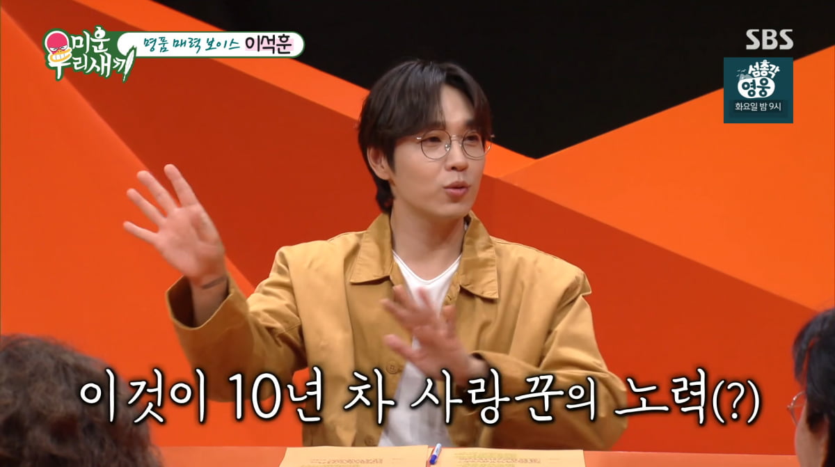 [텐아시아=김은정기자]사진=SBS'미운우리새끼''미운우리새끼'이석훈이경제권을모두아내에게넘겼다고밝혔다.31일방송된SBS예능프로그램'미운우리새끼'(이하'미우새')에는가수겸뮤지컬배우이석훈이출연했다.올해결혼10년차인이석훈은"발레리나아내를보고여전히설렌다.그말을하면원성이쏟아지는데,여전히아내보면설렌다"며'사랑꾼'면모를제대로드러냈다.이석훈은"신비감유지를위해집에서큰일볼때마다노래를틀거나,부른다"고밝히며"아직까지생리현상을안텄다.단한번도아내앞에서한적이없다.초등학생아이만텄다"고말했다.사진=SBS'미운우리새끼'사진=SBS'미운우리새끼'사진=SBS'미운우리새끼'그러면서"만약화장실을써야하면,내가가니까오지말라고한다.또화장실다른곳쓰라고한다"고강조해눈길을끌었다.화장실에서트는노래는발라드라고.서장훈이"아래,윗집은노래소리들리면'또이석훈이화장실갔구나'아는거아니냐"고묻자,이석훈은"볼륨을줄이겠다"고말해웃음을안겼다.재방료,저작권료를포함한모든수입과경제권을아내에게맡겼다는이석훈은"아내가저보다현명하고수계산이나보다빠르다"면서"내가일하고아내가재무,세무관련일다해주니까훨씬편하다"고전했다.사진=SBS'미운우리새끼'사진=SBS'미운우리새끼'사진=SBS'미운우리새끼'"용돈받는건아니다.내가쓸건다쓴다"는이석훈은'아내가모르는비상금'여부를묻자"비상금없다.아내가공인인증서모든걸알고있다.숨길수가없다"고이야기했다.이에신동엽은"왜'미우새'출연료를현찰로달라고했냐"고짓궂게놀렸고,이석훈은"진짜오해가생길수있다"며손사래를치며해명해폭소케했다.한편,이석훈은미스코리아출신발레리나최선아와2016년결혼해슬하에외동아들을두고있다.김은정텐아시아기자[email protected]©텐아시아.무단전재및재배포금지.