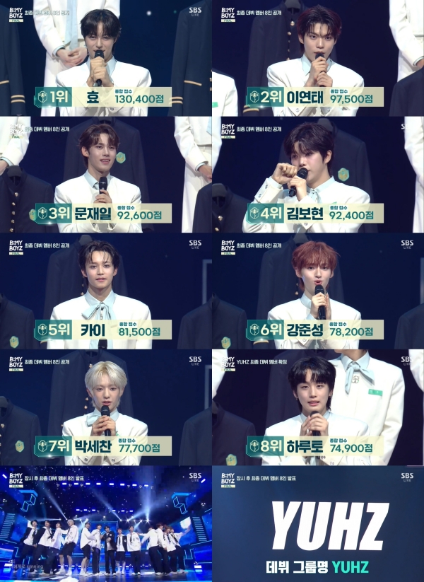 사진=SBS[스포츠투데이김태형기자]효,이연태,문재일,김보현,카이,강준성,박세찬,하루토가YUHZ(유어즈)로데뷔한다.지난30일생방송으로진행된SBS초대형글로벌오디션프로그램'B:MYBOYZ'(이하'비마이보이즈')파이널라운드에서는치열한경쟁을뚫고살아남은TOP8효,이연태,문재일,김보현,카이,강준성,박세찬,하루토가YUHZ(유어즈)로데뷔를확정했다.'비마이보이즈'는지난6월첫방송을시작으로톱아이돌NCT,몬스타엑스,워너원,동방신기와함께4개라운드를거쳐왔다.이날최종회는'비너스(B:inUS)파이널PICK매치'로,사전투표60%,생방송실시간투표40%를합산해단8명만이살아남는극한의승부였다.MC아이들미연,덱스가동반진행을맡았고,마스터후이,진호,유주,리아킴,이유정이같이자리했다.효·문재일·김보현·강준성·카이·이연태·양현빈·박세찬·하루토·서준혁·이윤성·반다니엘·아이는밝은분위기의시그널송무대로포문을열었다.본격적인경연이시작됐고,김보현·박세찬·서준혁·아이·양현빈·효가'낙킹온헤븐(KNOCKIN'ONHEAVEN)'으로선공을펼쳤다.원곡자후이는"난이도가있는곡이었는데100%완벽한무대를보여줬다.짧은시간안에큰성장을한비기너들이앞으로더성장하는과정에동료로서함께하겠다"고극찬했다.안무를창작한리아킴은"이미데뷔한친구들같은프로페셔널한무대였다.힘든춤을라이브와같이소화한다는게엄청나다"라고칭찬을아끼지않았다.마지막무대를마친김보현은"4개월동안멋진친구들과소중한추억을함께경험할수있어서영광이었다"라는소감을전하며눈물을흘렸다.효는"후회없이끝까지달리고싶었다.후이마스터님의노래로마지막무대를할수있어영광스럽다"고밝혔다.강준성·문재일·반다니엘·이연태·이윤성·카이·하루토의'비스듬히'무대도공개됐다.원곡자이자마스터후이는"거의찢었다.체력적으로힘든노래인데오히려여유있게선보일정도로연습을정말열심히한것같다"라고칭찬했다.진호는비스듬히앉아있는자세로"이정도로빠져들었다.누구한명을고른다는게마음아플정도로모두가완벽했다"라고애정을드러냈다.드디어베일을벗은데뷔그룹명은YUHZ(유어즈).YourHertz(유어헤르츠)의약자로,세상의흩어진파동이모여하나의진동으로이어지듯세상의다양한목소리를담아노래하겠다는희망의메시지를담은팀명이다.이어데뷔멤버톱8발표가시작됐다.가장먼저데뷔가확정된7위박세찬은"비너스여러분감사하다.아티스트로서멋진모습보여드리겠다"고다짐했다.6위강준성은"꿈만꿔왔던데뷔를하게돼신기하다.앞으로도열심히하겠다"고전했다.5위카이는"저를믿어주신가족들께감사드린다.겸손하게최선을다하겠다"고인사했다.4위김보현은눈물을흘리며"평범한학생이었던제가비너스덕분에행복한꿈을꿨다.저혼자이자리까지온게아니다"라고진정성있는소감을밝혔다.3위문재일은"응원해주신팬분들과비기너친구들에게감사하다.앞으로도기대해달라"고말했다.대망의1위는효가차지했다.효는"두번째서바이벌도전이라절대후회없이데뷔를향해달려가고싶었다.너무의미있고행복한도전이었다"며울컥한모습을보였다.2위이연태는"걱정이많았는데점점성장해서2위를할수있도록만들어주신비너스팬분들께감사하다"고이야기했다.마지막으로발표된YUHZ(유어즈)멤버8위의주인공은하루토였다.하루토는"마지막자리에올라갈수있게돼감사하다.한국어도,춤도,노래도많이노력하겠다"며눈물의소감을전했다.4개월간의치열한경쟁을마무리하고효,이연태,문재일,김보현,카이,강준성,박세찬,하루토8인조로완성된YUHZ(유어즈)는본격적인K팝신예그룹으로서의첫걸음을내딛는다.[스포츠투데이김태형기자[email protected]]Copyright©스포츠투데이.무단전재및재배포금지.