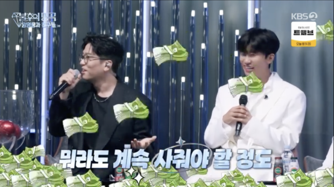 [OSEN=김채연기자]이적이임영웅파워를자랑했다.30일오후방송된KBS2TV‘불후의명곡-임영웅과친구들’에는임영웅과함께이적,린,로이킴,조째즈,노브레인,전종혁,최유리가출연해2주간시청자들을만난다.이날이적이등장하자임영웅의절친한동생전종혁도팬심을드러냈고,임영웅은이를질투하면서“어떻게자리바꿔줄까?”라고토로해웃음을안겼다.이적역시임영웅과팬심으로엮여있다고.이적의모친이임영웅의팬이라“너는임영웅한테곡을줘야해”라고했고,이후실제로임영웅의곡요청이들어오자어머니의말을떠올렸다고.이렇게만들어진곡이‘다시만날수있을까’였다고.이에이찬원은“작사가김이나씨가임영웅씨에작사를선물했더니가장효자곡이됐다고언급한적이있다.‘다시만날수있을까’는어떠냐”고물었다.이에이적은“저작권료라는거있잖아요.김이나씨는작사만했잖아요.저는이노래작사,작곡을다했다”고자랑해웃음을자아냈다.이어“만날때마다제가뭘사려고기다리고있다.제가그이후로7곡정도를써두고있다.근데매번녹음이다됐다고하더라”고토로했다./[email protected][사진]방송캡처Copyright©OSEN.무단전재및재배포금지.