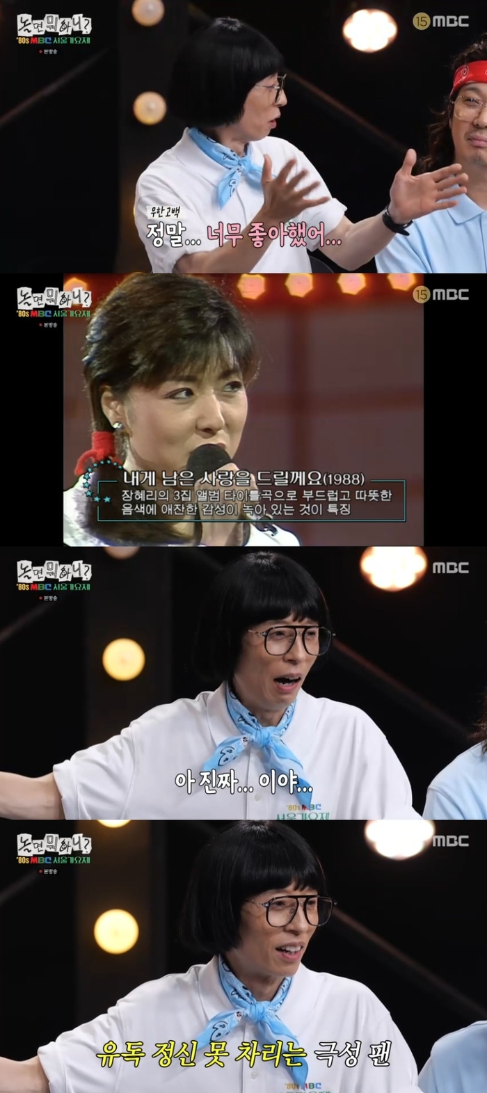 ‘놀면뭐하니’.사진IMBC유재석이장혜리의극성팬임을인증했다.29일오후방송된MBC예능프로그램‘놀면뭐하니?’(연출김진용장우성장효종왕종석,작가최혜정)에서유재석이장혜리의‘내게남은사랑을드릴께요’을듣고감탄했다.이날방송에서유재석은시청자가뽑은80년대노래중다시듣고싶은곡5개를소개했다.이상은의‘담다디’와무한궤도의‘그대에게’가공동5위를차지한가운데4위는장혜리의‘내게남은사랑을드릴께요’가차지했다.특히유재석은“너무매력적이었어요.정말너무좋아했어!”라며극성팬임을증명했다.장혜리의노래가나오자유재석은“누나!누나너무좋아요!정말힙하지않아요?”라며정신을못차렸다.그는“이야...진짜이거빠진다”라고혼자열광해좌중을폭소케했다.최유리가“너무하고싶었던곡”이라고하자이적은“유리씨가하면음원1위하겠는데요?”라고칭찬했다.최유리가바로한소절부르자모든패널은소리를지르며“이야됐다”라며감탄했다.MBC‘놀면뭐하니?’는매주토요일오후6시30분방송된다.[서예지스타투데이객원기자]Copyright©스타투데이.무단전재,재배포및AI학습이용금지