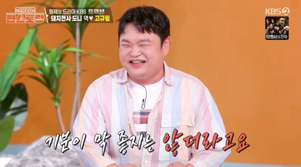 편스토랑고규필/사진=KBS2캡처[스포츠투데이임시령기자]'신상출시편스토랑'고규필이마동석과의일화를전했다.29일방송된KBS2예능'신상출시편스토랑'에서는그룹아이브가을,신지,김강우,고규필이스페셜MC로나섰다.이날가을은"오늘나오게되어서너무기쁘다"고밝은모습으로인사했다.이어"아이브가'XOXZ'라는신곡으로컴백했다.처음들어보셨을거다.저희가이번에새로만든신조어다.'잘자사랑해내꿈꿔'라는.이정현선배의'내꿈꿔'다"라며"꿈에서만나자는뜻"이라고설명했다.이후고규필도등장했다.현재방송중인마동석드라마'트웰브'에서십이간지12천사중돼지역할로활약중인고규필이다.고규필은"마동석선배가전화를해서'돼지가나오는데너말고다른대안이없다'더라.기분이좋으면서도막좋지는않더라"고해웃음을안겼다.그러면서"마동석과4개째작품중이다.음식호흡은좋지않다.매운것을좋아하는데저는매운것을잘못먹는다"고털어놨다.[스포츠투데이임시령기자[email protected]]Copyright©스포츠투데이.무단전재및재배포금지.