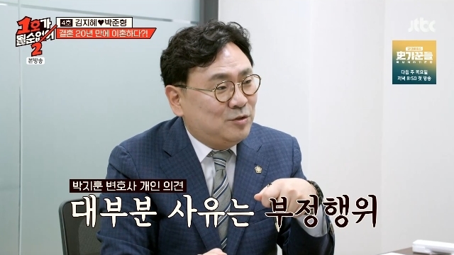 JTBC‘1호가될순없어2’캡처JTBC‘1호가될순없어2’캡처[뉴스엔서유나기자]박지훈변호사가성격차이이혼에대해충격발언을했다.8월28일방송된JTBC예능'1호가될순없어2'14회에서는이혼체험에나선21년차부부김지혜,박준형의모습이그려졌다.이날김지혜,박준형은이혼서류를작성하는모습으로지켜보는부부들을놀라게만들었다.박준형이"죄송하다"고하자최양락은"이혼은안된다.협회장한테말한마디없이니들끼리결단하면어떡하냐"며결사반대를하고나섰는데,김지혜는"프로그램이중요한게아니라제인생이중요하다"고말해모두를당황시켰다.박준형과김지혜는사실"저희가이제21년차부부다.지나온20년의세월을돌아볼겸좀특별하게이혼체험을해보기로한것"이라고밝혔다.진짜이혼이아니었던것.박준형은이후박지훈변호사에게상담을받으러갔다.그는우리나라이혼은협의이혼과재판이혼으로나뉘어진다며이혼동의,재산분할,양육권,양육비,면접교섭권5가지가합의되면협의이혼이가능하지만그게아니라면재판이혼을가야한다고설명했다.재판이혼을갈경우이혼사유가필요하다고.박준형이"대부분성격차이아니냐.연예인들보면성격차이던데"라고하자박지훈변호사는"실제로성격차이로이혼하는사람은없다.이혼이안된다"고말했다.박준형이"기사로그렇게나던데?"라며당황하자박지훈변호사는"대부분부정행위다.그렇게말하기뭐하니까"라고설명했다.뉴스엔서유나stranger77@기사제보및보도자료[email protected]ⓒ뉴스엔.무단전재&재배포금지Copyright©뉴스엔.무단전재및재배포금지.
