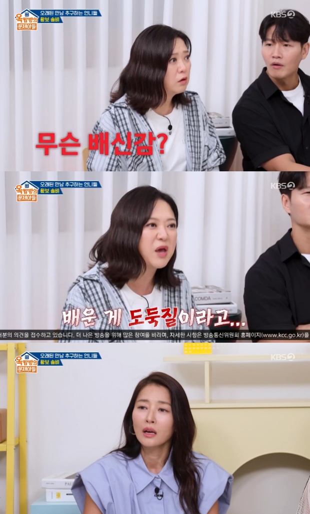 '옥탑방의문제아들'28일방송KBS2TV'옥탑방의문제아들'KBS2TV'옥탑방의문제아들'(서울=뉴스1)박하나기자=가수황보가코미디언김숙에게서운함을드러냈다.28일오후방송된KBS2TV예능프로그램'옥탑방의문제아들'(이하'옥문아')에서는연애리얼리티프로그램'오래된만남추구'(이하'오만추')에출연중인황보와솔비가퀴즈에도전했다.평소가족같이절친한사이로알려진황보,송은이,김숙.그러나송은이는황보가김숙에게배신감을많이느끼고있다고전해눈길을끌었다.이에황보는"배신감은아니고,실망과서운함은있다"라며"분명히송은이언니처럼일만하고살지말자고약속했는데,(김숙도)똑같이살고있다"라고바빠진김숙에게서운함과건강걱정을전했다.김숙은"송은이언니사는방식을이해못했다"라며모임7개에쪽잠을자면서까지바쁘게사는송은이를과거에는이해하지못했다고고백했다.그러나김숙은"어느순간배운게도둑질이라고,옆에있다보니까"라며송은이를닮아가게됐다고털어놨다.더불어김숙은오랜공백후생긴활동에일의소중함을느끼고더활발히활동중이라고덧붙였다.한편,KBS2TV'옥탑방의문제아들'은감성터지는옥탑방에서지지고볶는문제아들의찐케미에방문하는게스트들의인생이어우러져세상에대한진정한지혜를얻어가는대환장지식토크쇼프로그램으로매주목요일오후8시30분에방송된다[email protected]©뉴스1.Allrightsreserved.무단전재및재배포,AI학습이용금지.