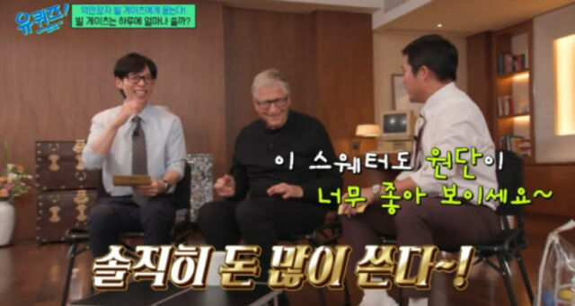 '유퀴즈'./tvN[마이데일리=곽명동기자]방송인조세호가빌게이츠의옷차림에관심을보였다.지난27일방송된tvN유퀴즈온더블럭에는빌게이츠재단이사장빌게이츠가출연했다.세계적인부호인빌게이츠는이날“하루에돈을얼마나쓰느냐”는질문에“솔직히꽤좋은집에살고있다”고답했다.이어“큰정원이있고,맛있는음식을요리해주는분들도있으며,여행할때는전용기를이용한다”면서“죄책감이들때도있지만그덕분에아프리카를비롯해전세계를다닐수있다”고덧붙였다.그는또“삼성의폴더블폰을사용하고있다”며“이재용회장에게선물받아돈을내지않았다”고말해웃음을자아냈다.조세호는“검소한걸로유명하신데,평소콜라와치즈버거를좋아하신다고들었다”고물었고,빌게이츠는“맞다.햄버거는실패가없다.일주일에네번은햄버거와감자튀김을먹는다”고답했다.이어조세호가“스웨터원단이너무좋아보인다”고말하자,빌게이츠는“맞다.그런데브랜드는모른다”고답해웃음을안겼다.촬영이끝난뒤인증샷을찍을때,빌게이츠는자신과같은휴대폰을들고있는조세호를보며“나랑같은폰이다”라며반가움을드러냈다.Copyright©마이데일리.무단전재및재배포금지.