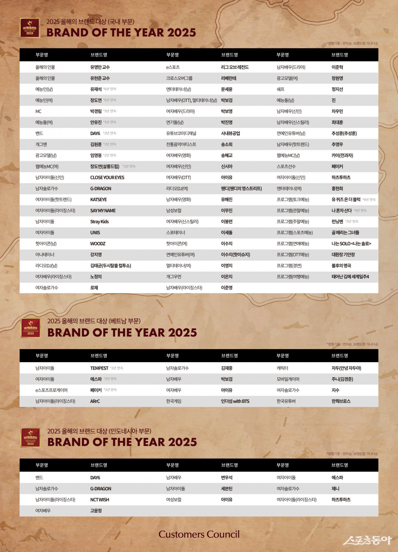308만5743명이참여하고총2827만1703건의투표가집계된‘2025올해의브랜드대상’에서올해를빛낸스타와프로그램들이공개됐다.한국소비자포럼은국내외소비자투표결과를반영한‘2025올해의브랜드대상’인물·문화부문수상자를발표했다.‘국민MC’유재석은남자예능인부문에서6년연속1위를기록하며인물·문화부문최초의연속수상기록을세웠다.그는공중파·OTT·유튜브등다양한플랫폼에서‘유퀴즈온더블럭’,‘런닝맨’,‘놀면뭐하니?’등을맡아진행했다.배우박보검은남자배우(OTT),멀티테이너,베트남부문남자배우까지3관왕을차지했다.넷플릭스‘폭싹속았수다’에서의호연과KBS‘더시즌즈’MC활동으로섬세한연기력과안정된진행능력을동시에인정받았다.e스포츠레전드‘페이커’이상혁은올해의스포츠선수로뽑혔다.그는LCK최초700승달성,롤드컵5회우승,아시안게임금메달등화려한커리어에더해T1과2029년까지재계약하며‘원클럽맨’상징을확고히했다.해외부문에서는그룹스트레이키즈(StrayKids)가남자아이돌부문에서당당히이름을올렸다.독창적인음악과강렬한퍼포먼스로글로벌팬덤을확대하며K-POP대표그룹으로자리매김했다.여자아이돌부문에서는에스파(aespa)가베트남·인도네시아양국에서동시에수상,글로벌인기를증명했다.아이유는인도네시아에서여성보컬과여자배우(OTT)부문을동시에수상하며독보적영향력을드러냈다.지드래곤역시인도네시아남자솔로가수부문에서선정되며변함없는존재감을과시했다.이외에도인도네시아에서는세븐틴(남자아이돌),변우석(남자배우),고윤정(여자배우),제니(여자솔로가수)등이수상의영예를안았다.베트남에서는TEMPEST(남자아이돌),김재중(남자솔로가수),아이유(여자배우),지수(여자솔로가수)등이브랜드파워를입증했다.프로그램부문에서는tvN‘유퀴즈온더블럭’이6년연속토크예능부문대상을수상하며최장기록을세웠다.빌게이츠,스칼렛요한슨등세계적인사까지출연시킨이프로그램은국경과세대를아우르는대화의장으로평가받는다.MBC‘나혼자산다’는4년연속관찰예능1위를차지했으며,SBS‘런닝맨’,SBS플러스‘나는SOLO’,tvN‘불후의명곡’등도각장르부문에서수상했다.김겨울기자[email protected]©스포츠동아.무단전재및재배포금지.