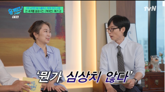 [OSEN=박근희기자]'유퀴즈온더블럭’유재석이딸나은이덕분에영화'케데헌'예고편을보고대박을예감했다.27일전파를탄tvN‘유퀴즈온더블럭’에는넷플릭스애니메이션영화'케이팝데몬헌터스'(이하'케데헌')의매기강감독이게스트로출연했다.유재석은딸나은이와함께영화‘케데헌’의예고편을보고뭔가심상치않았음을느꼈다며극찬을아끼지않았다.이어유재석은‘케데헌’의성공요인으로신선한소재와한국문화를꼽았다.유재석은"케이팝과한국문화의어우러짐이신의한수"라며,"기가막히다고생각했다"고감탄했다.케데헌의흥행은영화의인기뿐만아니라,극중등장한김밥에대한관심으로이어지고있다고.영화를본관객들사이에서'김밥직접만들어먹기'챌린지가유행하고있다는것.이소식을들은매기강감독은"몰랐다"며놀라움과반가움을동시에표현했다./[email protected][사진]‘유퀴즈온더블럭'방송화면캡쳐Copyright©OSEN.무단전재및재배포금지.