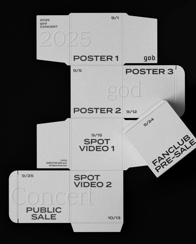 지오디,연말완전체콘서트…프로모션포스터공개(제공:젬스톤이앤엠)그룹god(지오디)가완전체콘서트프로모션일정이담긴포스터를공개하며본격적인예열에나섰다.god는8월27일0시공식SNS를통해올해연말개최되는완전체콘서트에대한기대감을높이는프로모션포스터를공개했다.이번공개된포스터는콘서트개최에앞서순차적으로진행될다양한콘텐츠와예매일정을담고있다.입체적인박스형태로디자인돼각면마다포스터·스폿비디오공개일정과예매정보를기재,마치조립전펼쳐놓은패키지박스를연상시킨다.단순한일정안내를넘어시각적재미와콘셉트를동시에전하며,콘서트의무드와멤버들의매력을예고하는비주얼로팬들의기대감을한층끌어올리고있다.특히,이박스가상징하는의미가무엇일지에대한호기심을자극하며,이후공개될콘텐츠에대한관심을한층고조시킨다.9월1일첫번째포스터를시작으로5일두번째,12일세번째포스터가순차적으로공개되며완전체콘서트에대한기대감을점차높일예정이다.각포스터는콘셉트와무드,멤버들의매력을담아내팬들의관심을더욱끌어올릴전망이다.이어9월15일과10월13일에는각각‘스폿비디오’1편과2편이공개된다.콘서트무대와콘셉트를미리엿볼수있는단서가담길것으로예상돼,어떤장면이펼쳐질지벌써부터이목이집중되고있다.단계적으로이어지는이번프로모션은연말공연의서막을알리는신호탄이될것이다.예매는9월24일팬클럽선예매로시작된다.선예매는공식팬클럽‘fangod’7기가입자를대상으로진행되며,다음날인9월25일부터는일반예매가오픈된다.올해연말열리는god의완전체콘서트는서울과부산두도시에서개최된다.이는2022년‘god[ON]’,2023년‘god’sMASTERPIECE’,2024년‘CHAPTER0’에이어4년연속이어지는단독콘서트그자체로의미가남다르다.god는매번새로운시도와완성도높은연출로찬사를받아왔다.이번공연에서도세심하게짜인세트리스트,압도적인라이브,멤버들의매력이어우러져또한번레전드급감동을선사할것으로기대를모은다.2025년god완전체연말콘서트의세부내용은추후공식SNS채널을통해공개될예정이다.이다미기자bnt뉴스연예팀기사제보[email protected]©bnt뉴스.무단전재,재배포및AI데이터활용금지