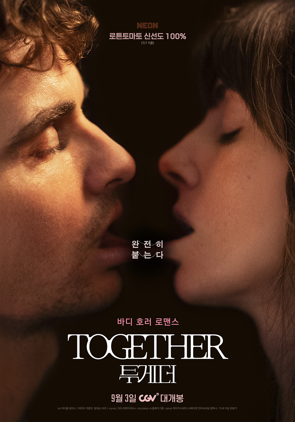 <투게더>호평이유는공포영화로서본질에충실한재미를제공한다는점이다.또한연출과더불어주연을맡은남녀배우의매력적인연기는영화에생명을불어넣는다./그린나래미디어㈜제목:투게더(Together)제작연도:2025제작국:미국,호주상영시간:102분장르:공포,로맨스감독:마이클생크스출연:데이브프랭코,알리슨브리,데이먼헤리먼개봉:2025년9월3일등급:15세이상관람가21세기영화산업은분명히과거와다른생태계안에서재편되고있다.필름의굴레를벗어던진디지털시대는이전보다저렴하고양질의영상제작환경을조성했다.유튜브로대표되는동영상플랫폼은누구라도자신의창작물을공유하고평가받을수있는시험대이자주류세계로의진입을가능케하는고속통로가되고있다.도제시스템이나전통적교육과정을통해실현됐던장편영화감독데뷔는이제과거의이야기가됐다.지난10여년동안말그대로혜성처럼나타난신인상당수가몇편의단편영화,심지어는장난스러운영상클립이눈에띄어감독의기회를거머쥐기도했다.지난6월6일개봉한밀도높은공포영화<브링허백>의연출을맡은대니필리포,마이클필리포형제와마찬가지로<투게더>를연출한마이클생크스역시호주출신의신예로이번작품이첫장편영화다.어려서부터영화를좋아하고소소한영상물만들기에심취했던생크스감독은다양한공모와경연대회에참가하며창작의기회를이어갔다.2006년9월개설한뒤현재20만명이넘는구독자를보유한개인유튜브채널‘팀팀페드(youtube.com/timtimfed)’는그의경력에중요한도약대로차곡차곡연출가의가능성을준비하고입증한무대가됐다.권태로운연인에게마침내도래한난관꽤오랫동안연인관계였던것으로보이는팀(데이브프랭코분)과밀리(알리슨브리분)는활력을잃은무기력한삶의전환을꿈꾸며시골로이사한다.주변숲을산책하다가폭우를만나길을헤매던두사람은설상가상으로구덩이속으로떨어지고기괴함이가득한이곳에서비가그치기를기다린후귀가한다.이후두사람사이에는알수없는강렬한이끌림이시작되고,결국잠시라도떨어져서는견딜수없는밀접한(?)육체적관계의변화까지마주하게된다.일단<투게더>에긍정적평가를할수있는이유는공포영화로서본질에충실한재미를제공한다는점이다.같은장르안에서수없이봐왔던장소,행동,대사들이새롭고효과적으로재활용되고,일상의이질적순간을독특한관점에서포착해공포로치환해낸다.최근주목받고있는‘보디호러(BodyHorror)’에충실한장르적외형은이영화가전하고자하는‘긴밀하고특별한관계’에대한괴팍한우화이자노골적은유다.흔히‘나의반쪽’이라고도표현하는‘영혼의파트너’란존재하는것일까?함께하기위해서필연적으로감내해야할‘희생’또는‘상실’의크기와고통이란얼마나될까?감독은“이영화는누군가와인생을공유한다는것의잠재적인공포,즉‘헌신’이라는단어속에담긴지속적인불안감에관한이야기”라고설명한다.재능있는부부배우의혼신연기감각적이고명민한연출과더불어주연을맡은남녀배우의매력적연기는영화에생명을불어넣는데중요한요소가되고있다.각자가배우,연출가,제작자로서의출중한활약을펼치고있을뿐아니라실제부부이기도한데이브프랭코,알리슨브리커플은‘동반자’로서의행복과고통을표현하는내면연기뿐아니라노골적이고긴밀한접촉이불가피한과격한육체연기까지자연스럽게소화해냈다.<투게더>는지난1월개최된2025년선댄스영화제미드나잇부문에공식초청돼처음공개됐다.이후미국내배급권을따내기위한유명배급사,온라인플랫폼들의각축이있었다는후문이전해진다.치열한경쟁끝에최근작품성있는비영어권영화들의성공으로주목받고있는‘네온(Neon)’이승기를잡아북미배급권확보는물론전세계배급권판매까지담당하게됐다.‘메타크리틱’과함께양대리뷰사이트로꼽히는‘로튼토마토’에서신선도지수100%를기록해화제가됐고,국내에서는7월개최된제29회부천국제판타스틱영화제를통해선공개돼관람객들의호평을끌어냈다.공포영화팬이라면꼭놓치지말아야할작품이다.북미관람문화의혁신을이끄는배급사‘네온’/cinemadailyus.com미국관객들이자막읽기를싫어한다는건오래전부터공공연히알려진사실이다.영화강국을자처하는자존심도있겠지만,화면과자막을동시에판독하고이해하는행위자체를꽤번거롭고귀찮게생각한단다.당연히비영어권인다른나라의작품들이소개될기회는줄어들고,누릴수있는문화영역의폭은협소해질수밖에없다.2020년제92회아카데미시상식에서<기생충>으로작품상을받은봉준호감독이수상소감에서‘1인치정도되는자막의장벽을뛰어넘으면더많은영화를즐길수있을것’이라고말한것도여기서비롯된다.소위‘빅5’라언급되던월트디즈니스튜디오,워너브러더스,유니버설픽처스,파라마운트픽처스,소니픽처스등이제작과배급을자체적으로동시에진행하던과거와달리,코로나19이후IPTV,VOD,온라인스트리밍서비스등2차플랫폼시장이급격한성장세를누리면서특화된취향과참신한전략으로승부하는배급사들의영향력은크게성장했다.지면을통해여러번언급했던‘A24’를선두로‘IFCFilms’,‘네온’등의배급사로고는이제하나의브랜드로소비되며관객들의신뢰를얻고있다.