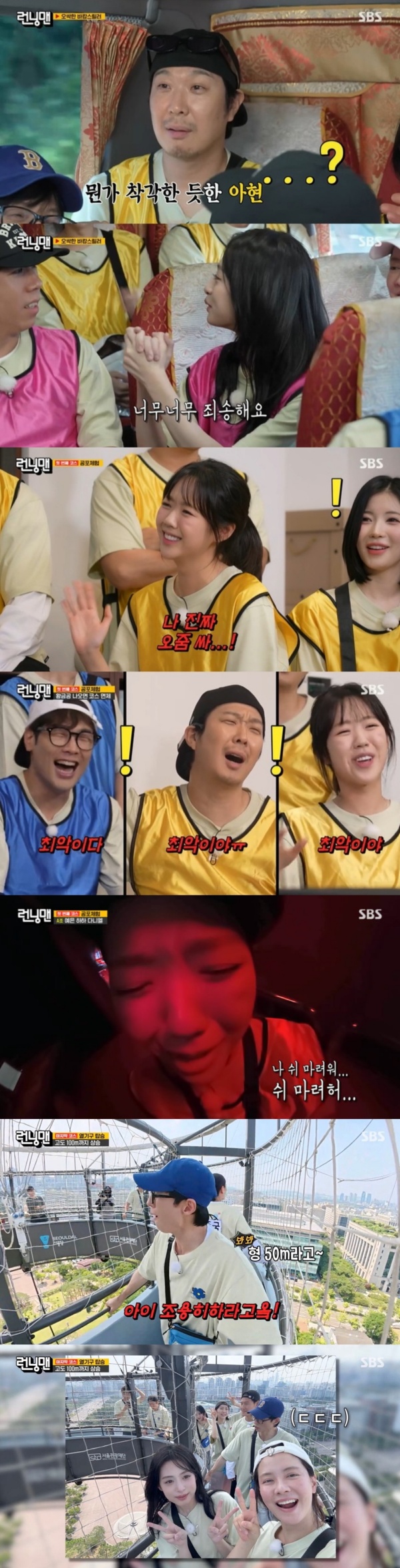 런닝맨/사진=SBS캡처[스포츠투데이정예원기자]'런닝맨'지예은이공포체험전과후상반된반응을보였다.지난6일방송된SBS예능'런닝맨'은'오싹한바캉스릴러'특집으로꾸며져배우주현영,베이비몬스터아사,아현이게스트로출연했다.닐슨코리아에따르면이날수도권가구2049시청률은2.2%로동시간대예능1위를기록했다.분당최고시청률은4.8%까지뛰어올랐다.먼저'런닝맨'의'비공식가족'이나다름없는주현영은등이파인파격적인의상을입고오프닝에등장했다.깜짝놀란유재석은"송지효를오래알고지내다가갑자기생배를봤을때느낌"이라고말했다.이어유재석은"지예은이주현영과김아영이오면늘긴장한다.중간중간우리말에말을하나씩섞는다"고폭로했다.주현영은이를놓치지않고지예은에게"긴장했느냐"고물었고지예은은"안했다.전혀"라며부정해웃음을선사했다.이밖에베이비몬스터의막내라인아사와아현이'런닝맨'에처음출연해환호를받았다.두사람은신곡'핫소스'(HOTSAUCE)를선보이며요즘대세걸그룹임을입증하는가하면엉뚱한예능감으로주목받았다.멤버들이나이를묻자,초등학교시절부터연습생생활을병행해온아사는"저는유졸이다"라고답해모두를놀라게했고아현은하하를이상민으로착각했다.이날레이스는'오싹한바캉스릴러'특집답게첫번째코스부터공포체험이진행됐다.특히,지예은은하하,최다니엘과공포체험에선정되자"저진짜오줌싼다.사고난다"를연발했다.지예은에더해최다니엘은제작진을보고돌고래비명을지르며공포체험은아수라장이됐다.간신히공포체험을마친지예은은대기실로돌아와서는"이정도면괜찮은데요?"라고허세를부렸다.지예은의허세는마지막바캉스코스에서도계속됐다.마지막바캉스는아사가원한130m수직상승하는열기구탑승이었다.'런닝맨공식쫄보'들은겁을냈고,하하가"이걸타봤는데방귀가계속나온다"고하자열기구탑승을자원한지예은은"방귀뀌고싶다.방귀한번시원하게뀌자"고말해폭소를선사했다.반면열기구를타게된유재석은겁에질려한발짝도움직이지않았고,최다니엘역시호들갑을떨어'쫄보'임을인증했다.최종레이스결과,하하와최다니엘,주현영이벌칙자로선정돼50인분빙수만들기벌칙을받았다.[스포츠투데이정예원기자[email protected]]Copyright©스포츠투데이.무단전재및재배포금지.